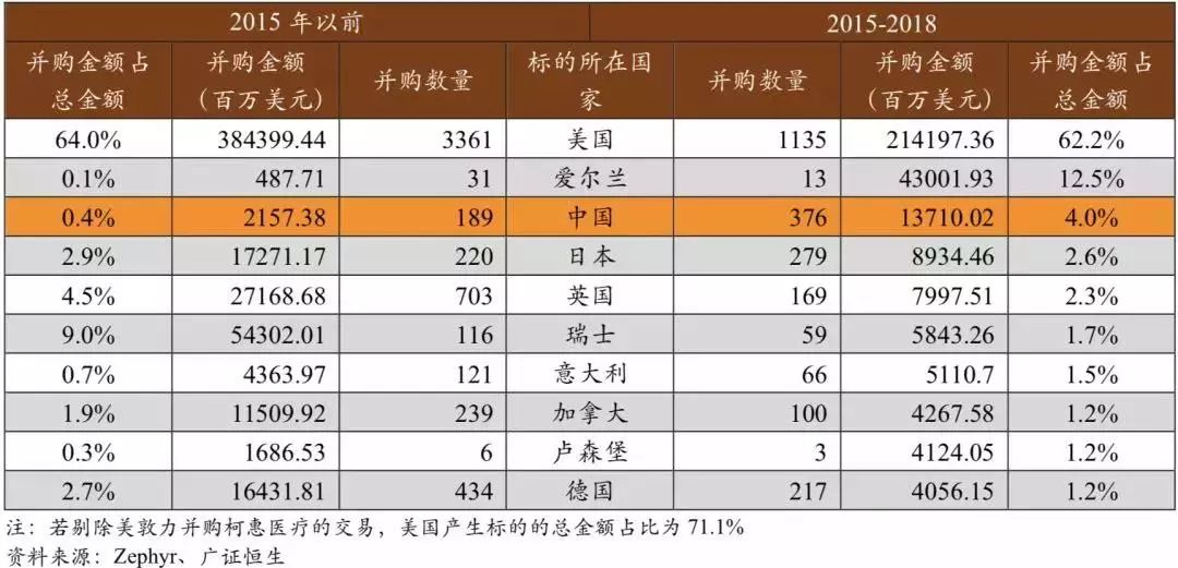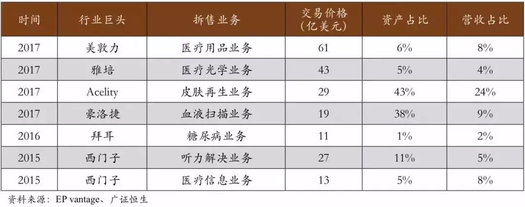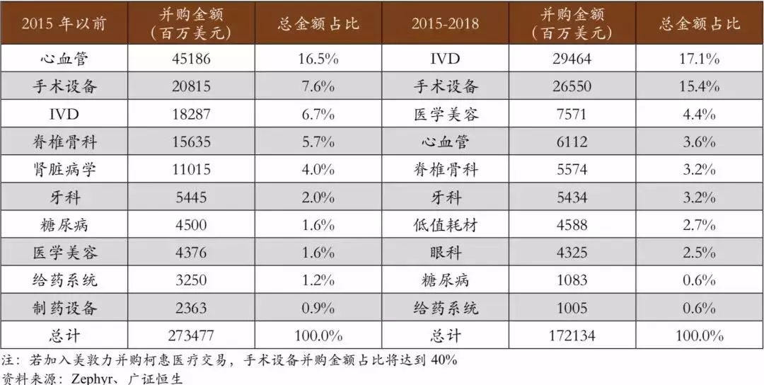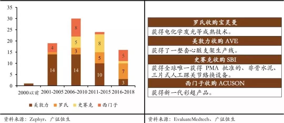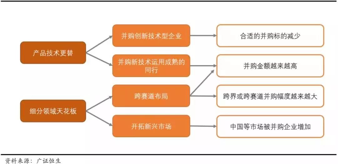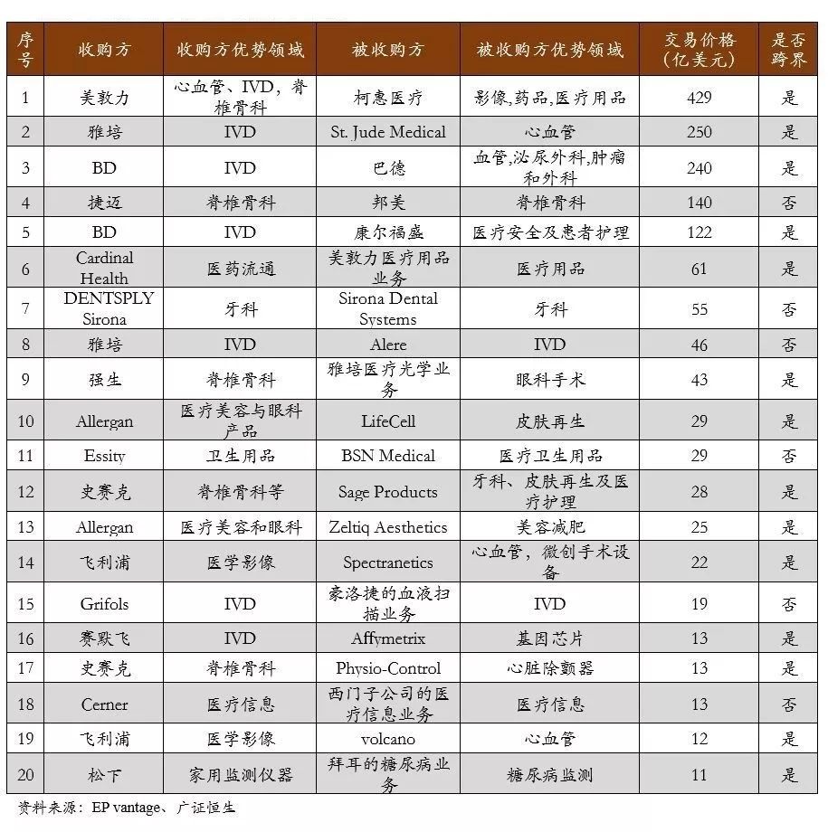 近些年,全球医疗器械行业的并购呈现三大特征: 1)越并越大,带来集中度越来越高,可并购对象越来越少; 2)产品跨界和赛道跨界尺度越来越大,主赛道结构性调整明显; 3)跨境并购提速,中国并购标的显著增加。 在这个问题上医械巨头也有两大对策: 1)向新兴市场扩张以抬高行业天花板; 2)通过跨赛道、跨界并购丰富其产品矩阵。因此近年来跨界以及跨国并购不断增加。 ▽医械巨头面临的主要问题及应对对策 产品跨界和赛道跨界尺度越来越大,主赛道出现结构性调整 产品跨界以及赛道跨界尺度越来越大。在近几年的行业并购中,跨界是医疗器械巨头并购案的主要方向。无论是从产品上还是在赛道上,行业巨头均通过并购实现着尺度越来越大的跨界扩张及竞争。在近几年top20 的并购案中,有 70%是来自于不同细分领域的医疗器械巨头的强强联合。其中,美敦力与柯惠医疗联手,构筑几乎覆盖医疗器械全领域的商业帝国;IVD龙头雅培、BD等也通过并购分别加强在心血管、 肿瘤等方面的布局。可以看出,近几年医疗器械巨头的并购呈现产品跨界以及赛道跨界尺度越来越大的特征。 巨头既有大手笔的购入资产,也有大规模地剥离业务部门。近几年医械巨头美敦力、雅培以及西门子分别对其医疗用品业务,光学医疗业务以及医疗信息业务进行了拆售。特别是 2017 年,在 TOP10 并购案中,就有 4 项是关于行业巨头的业务拆售。近 3 年医疗器械巨头一方面在收购资产扩大规模,另一方面也在剥离业务提高企业效率,总体上呈现“增肌减脂”的趋势。 ▽主要巨头开始拆售业务 赛道之间出现了比较明显的结构性调整。在并购方向上,相对于 2015 年以前的行业并购动向,并购赛道出现一定程度的结构性变化。其中 IVD、手术设备、以及医学美容领域为近三年的并购热点。近几年虽然医械行业内主要的并购依旧是围绕主赛道展开,但是赛道之间出现了比较明显的结构性调整。 ▽大型并购依旧围绕主赛道展开,但是赛道之间的结构性调整明显 跨境并购提速,中国并购标的显著增加 跨境并购出现了较为明显的提速。近几年,在医械行业的并购中,无论在并购金额还是在并购占比方面相对于 2015 年以前的行业并购均出现了较大程度的提升。 ▽跨境并购提速明显&剔除金额前20后跨境并购提速依旧明显 被并购标的集中欧美地区,我国被并购企业数量大幅增长。在并购标的地域方面,并购标的仍然集中于美国本土以及欧洲地区,近三年美国本土标的所产生的并购金额占比高达总金额的 62.2%,(若剔除美敦力并购柯惠医疗的交易,这一比例为 71.1%),欧洲标的产生的并购金额基本在 20%左右。延续了一直以来,医械企业并购标的主要产生于美国以及欧洲地区的基本格局。但是在近几年,中国的并购标的明显增加。2015 年以来,中国产生了 376 个并购标的,并购金额超过 13 亿美元,而在 2015 年以前的近二十年时 间里,我国仅产生了不到 3 亿美元的并购标的。可以看出,近三年来,国内企业的资本关注度大幅度提升。 ▽并购标的主要产生于美欧地区,中国企业近年来资本关注度有所提升 并购动因 >>>>并购动因一:产品技术的更新替代 医疗器械领域的技术以及产品始终处于快速地更新替代当中。相对于药品来讲,药品的研发周期很长, 一般在 10-15 年,产品更新换代慢,然而,医疗器械技术成熟快,产品迭代周期短,大企业“船大掉头慢”,中小企业外部研发具有独特优势。以 IVD 领域为例,行业的发展伴随生物化学、免疫学、分子生物学等领域的发展而发展,可分为三个发展阶段。第一阶段,20 世纪之前萌芽时期,使用一些传统的医学诊断技术; 第二阶段,20 世纪初期,随着现代医学的发展及酶催化反应与抗原抗体反应的发现,体外诊断逐步兴起。 第三阶段,1953 年后,DNA 双螺旋结构、单克隆抗体技术、大分子标记技术等技术的运用推动整个体外诊断行业跨越式发展。 ▽IVD 领域产品技术更新迭代速度较快 目前,化学发光免疫分析技术就在讯速地对原本的酶联免疫分析技术进行替代。单就免疫诊断一个领 域来讲,就经历了放射免疫分析技术(RIA)、免疫胶体金技术、酶联免疫分析技术(ELISA)、时间分辨 荧光免疫分析技术(TRFIA)和化学发光免疫分析技术(CLIA),每一次技术的更新都会对检测的灵敏度 以及准确性带来相应的提高,同时新技术的开发也会对过去技术以及产品产生迅速的颠覆以及替代。 ▽免疫诊断领域技术快速更新替代 ▽我国化学发光免疫分析技术正快速替代酶联免疫分析技术 不断进行技术性并购以降低内部研发风险。主要的医械企业应对技术更替所带来的市场份额下降的方 法主要有两种:其一是不断地买入创新技术企业以降低内部研发的风险,保持技术的相对领先。在过去的20年中,医械行业巨头几乎每年都有对创新技术企业的并购。 ▽医械巨头并购了大量的创新技术企业&通过并购医械巨头迅速完成技术的更新 并购同行竞争对手以迅速获取技术以及产品线。在通过并购迅速实现技术更新的案例中,罗氏并购宝灵曼的案例最为经典。上世纪 90 年代,随着国外化学发光技术的成熟,IVD 行业竞争格局开始快速重塑。 雅培等竞争对手最早于1993 年推出 Axsym 系列产品,紧接着1998 年推出其高端产品 Architecti2000,采用先进的三代发光技术吖啶酯直接化学发光。罗氏的诊断业务受到巨大冲击,收入出现负增长