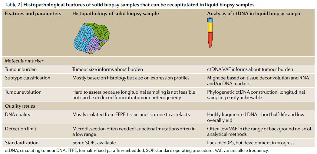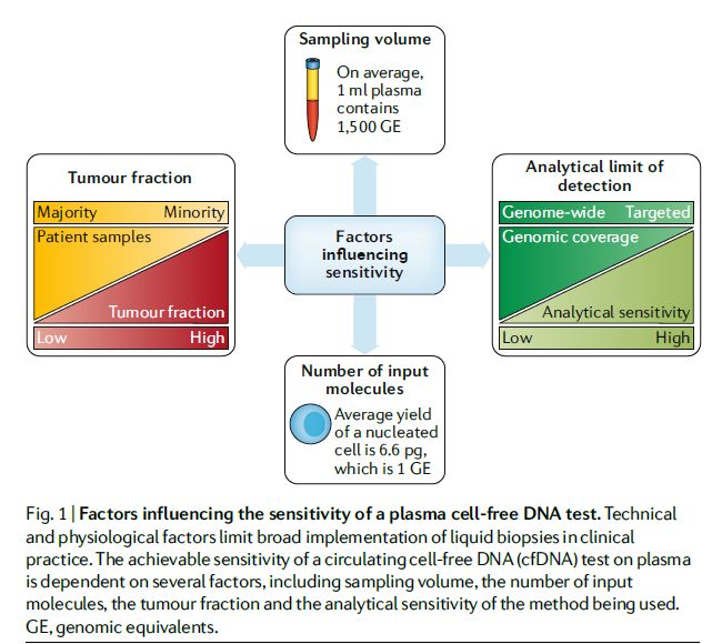 ▎药明康德编译整理(来源:《Nature Reviews Genetics》)精准肿瘤学的关键目标是改善癌症的诊断和治疗。而对肿瘤样本的一系列基因组和其它分子分析能够帮助发现标志物来帮助选择疗法,预测预后,跟踪肿瘤进化,以及发现不同转移性疾病的分子特征。基于下一代基因组测序(NGS)的分子分析方法已经在肿瘤分析方面得到应用,而综合DNA、RNA、蛋白质和表观遗传特征的多参数综合分析可能更准确地描述肿瘤特征并且帮助发现全新成药靶点。 目前,精准肿瘤学的焦点愈发转向液体活检,因为它不具侵袭性,而且可以在不同时间点重复进行,从而帮助监察疾病的进展。如今,外周血液中可以被检测的分析物(analyte)包括循环肿瘤细胞(CTCs);循环无细胞DNA(cfDNA),在癌症患者中它包含循环肿瘤DNA(ctDNA)。其它分析物物包括循环无细胞RNA(cfRNA);细胞外囊泡(EVs),例如外泌体和肿瘤“教育”的血小板(TEPs);蛋白质和代谢产物。近日,《Nature Reviews Genetics》 对在精准肿瘤领域液体活检的现状和未来进行了盘点,在今天的这篇文章里,药明康德的微信团队将与读者分享这篇综述的精彩内容。 ctDNA作为生物标志物的利与弊 ctDNA检测是目前市场上最常见的液体活检形式,它在具备巨大潜力的同时,在检测开发和临床应用的推广方面也面对着一系列挑战。 ctDNA作为精准肿瘤学生物标志物的潜力 研究表明,ctDNA可能由凋亡细胞释放,因此,它只代表了肿瘤细胞的一种特定亚群。尽管如此,ctDNA具有多个优点: 1. 它能够提供对肿瘤基因组的综合描述,因为ctDNA从多个不同肿瘤区域或多个病灶处释放,ctDNA分析可以发现组织活检中无法发现的体细胞突变。 2. 深度测序可以发现肿瘤内异质性和只在部分细胞中出现的基因突变。这通常需要大量的CTCs或者多次组织活检才能获得同样水平的信息。 3. ctDNA可以提供肿瘤大小的信息,从而反映出疾病的发展状态和对疗法的反应。研究发现,在非小细胞肺癌(NSCLC)和高级别浆液性卵巢癌(HGSOC)中ctDNA的突变等位基因频率(VAF)与肿瘤体积呈线性关系。 4. ctDNA还具备预测预后的价值。例如,在旨在治愈的手术或化疗之后,ctDNA的出现是癌症复发和不良预后的有力标志。它预测癌症复发的能力在结肠癌、卵巢癌、肺癌和乳腺癌患者中都得到了验证。 5. ctDNA分析能够发现肿瘤抗性的标志物,例如,在接受抗EGFR疗法的结直肠癌患者中出现的KRAS突变,以及在乳腺癌患者中的PIK3CA、MED1、或EGFR上VAFs的升高。 这些优点让ctDNA成为精准肿瘤学应用方面前景看好的分析物。然而ctDNA检测也需要克服血浆中ctDNA水平过低,细胞衰老带来基因变异的影响等挑战。 ▲组织活检与ctDNA检测特点对比(图片来源:参考资料[1])血浆中低水平ctDNA带来的挑战 在血浆cfDNA中检测到基因突变的能力与肿瘤负担有对应的关系。但是在不同患者身上的ctDNA水平可能相差很大,虽然他们患上同样类型的癌症。即使是在转移性癌症患者中,也有很大一部分患者血浆中ctDNA的比例异常的少。这清楚地表明,除了肿瘤负担以外,还有其它生物因素影响肿瘤DNA的释放。 据估算,1毫升血浆中含有大约1500个基因组当量(GE)的DNA片段,通常一次10毫升抽血可以从血样中获得4毫升血浆,意味着能够获得6000 GE的DNA片段。在VAF为0.1%的情况下,在这6000 GE的DNA片段中,平均只有6个DNA分子携带着想要检测到的基因突变,而且随机取样可能会影响这一数值。因此,可靠、准确并且可重复地检测到这些基因突变是一个严峻的挑战。 检测低水平ctDNA的方法 如果增加血样体积,可以检测到的分子数目自然会显著上升,但是多抽血的办法通常在晚期癌症患者中无法实现。另外一种克服携带基因突变的分子数目过少的方法是同时检测多种基因突变,然后确定一个基因突变数目的最低阈值来决定血浆样本是否为肿瘤阳性。例如,有的液体活检可以同时检验患者是否携带18种单核苷酸位点变异(SNV),如果检测到的SNV数目超过2个,则将ctDNA样本定义为肿瘤阳性。 近年来ctDNA检测技术的开发主要聚焦于增强测序技术的分析敏感度。测序技术的敏感度会受到测序准确性和测序深度的影响。通过使用分子条形码标记被测序的DNA片段,可以提高测序的准确性,从而提高发现基因突变的几率。 另一种提高敏感度的尝试是富集特定长度的ctDNA片段。有研究表明ctDNA 片段(132-145个碱基对)通常比健康细胞释放的cfDNA片段(~166碱基对)小。因此,富集特定大小的DNA片段进行测序可能提高发现基因突变的敏感度。 ▲影响循环无细胞DNA检测敏感度的因素(图片来源:参考资料[1])细胞衰老对ctDNA检测的限制 虽然这些技术的进步能够改善发现低VAF基因突变的能力,但是衰老细胞积累的体细胞突变也会对ctDNA的实用性添加限制。其中一个重要的干扰因素是良性体细胞基因突变随着细胞衰老而增加。在成人干细胞中出现的良性基因突变会随着细胞增殖传给下一代,有的时候在肿瘤驱动基因中出现的基因突变会导至携带这些突变的干细胞增殖速度更快,这可能被误认为肿瘤增生。因此,在肿瘤驱动基因中发现基因突变并不等同于发现癌症。 ctDNA检测的分析效度和临床有效性仍需确认 在临床护理中采纳肿瘤生物标志物检测的原则有三条:1. 分析效度(analytical validity),指的是检测的准确性、可靠性和可重复性;2. 临床有效性(clinical validity),指的是检测能够把患者分为不同群体,而且这些群体会有