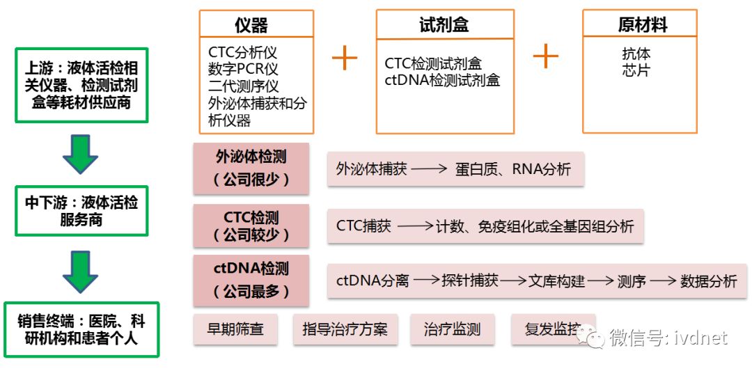 液体活检全产业链包括上游的仪器、检测试剂盒等耗材供应商和中下游的液体活检服务商。目前产业链上下游区分不明显,上游的制造商往往直接将检测技术和服务提供给医院、科研机构和患者个人,用于早期筛查、指导治疗方案、治疗监测或者复发监控。