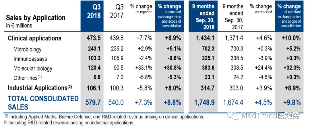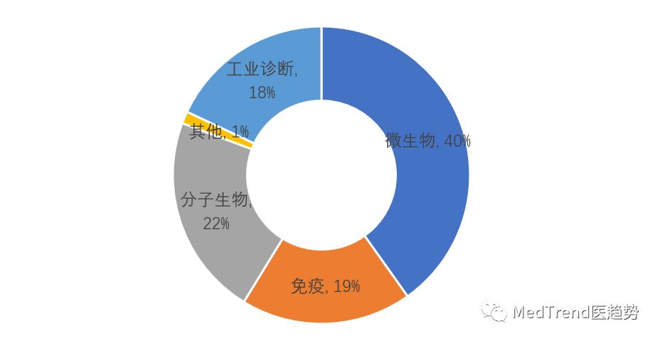 生物梅里埃公司董事长兼CEO Alexandre Mérieux 亲自出席会议并表示,“梅里埃方面会不遗余力地积极支持长光华医实施双方共同制定的五年行动计划,尽快达成两大目标。” 生物梅里埃的诚意,这大概是梅里埃能顺利参股长光华医的重要原因。 ▲生物梅里埃全球总裁Alexandre Mérieux 生物梅里埃发力中国二级市场 生物梅里埃为何选择了于2009年成立的长光华医? 生物梅里埃1963年创建于法国里昂,是最早进入中国市场的IVD巨头之一。生物梅里埃公司产品有两个应用领域 : 临床诊断产品和工业诊断产品。 ▲2018年Q3&9M 生物梅里埃营收数据 ▲2018年Q3&9M 生物梅里埃各业务占比数据 根据2018年Q3财报,截至9月底, 工业诊断产品:营收3.147亿欧元,同比+8.9%,仅占整体营收的18%。 临床诊断产品:营收14.341亿欧元,占整体营收82%的份额,是生物梅里埃营收的支柱。同比+10.0%,主要受到分子生物业务高达32.3%的高增长所驱动。 生物梅里埃的临床诊断产品主要包括传染病、微生物、心血管病和肿瘤病等四个领域。 生物梅里埃是微生物诊断领域的领导者。 微生物业务贡献了其营收的40%。VITEK®, VITEK® MS, API®, Previ® Isola, Previ® Color Gram, chromID® 是梅里埃的微生物系列品牌,包含了检测、识别和药敏反应。 免疫业务贡献了营收的19%,同比增长仅0.3%。核心机型为VIDAS系列的mini VIDAS和VIDAS 3,其主推项目为PCT和心标。 与此同时,生物梅里埃的免疫线已经多年没有新仪器出现,在现有仪器高速更新换代的情况下,生物梅里埃面临着沉重的压力。
