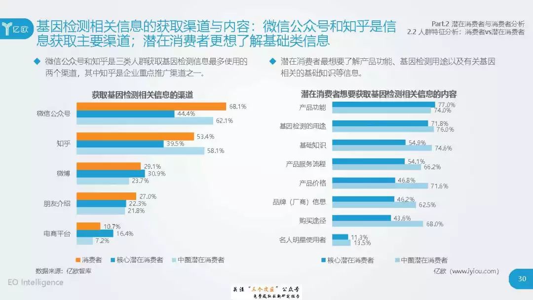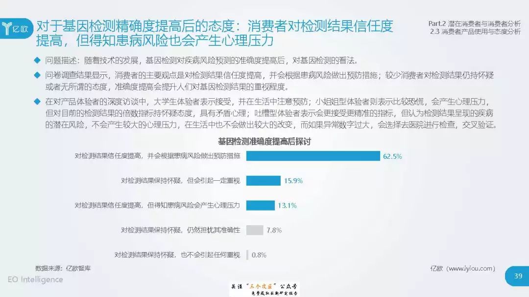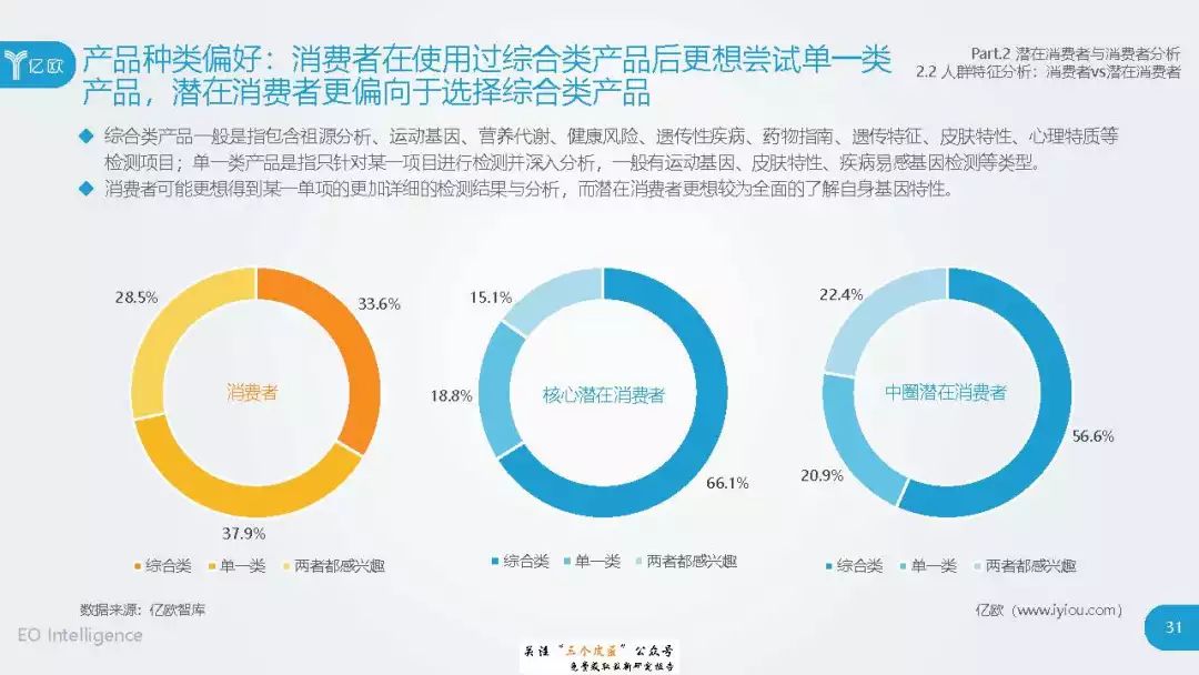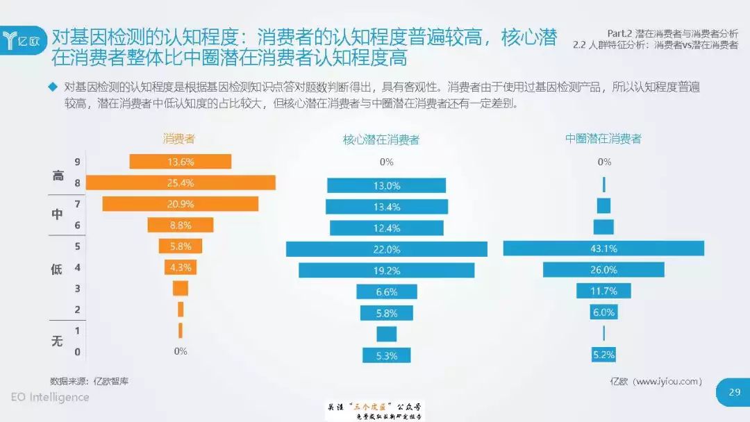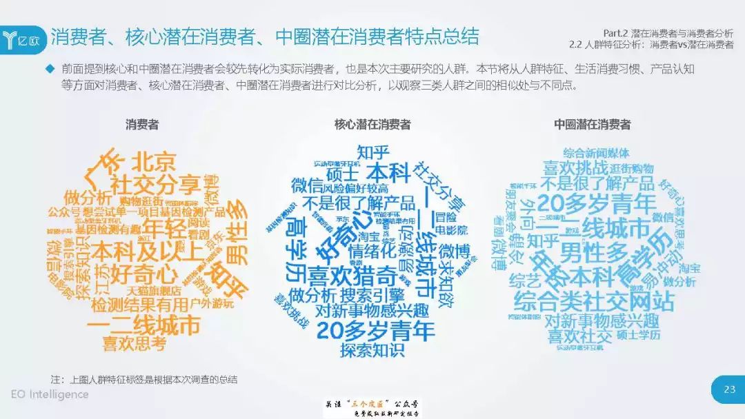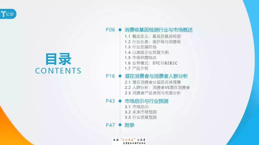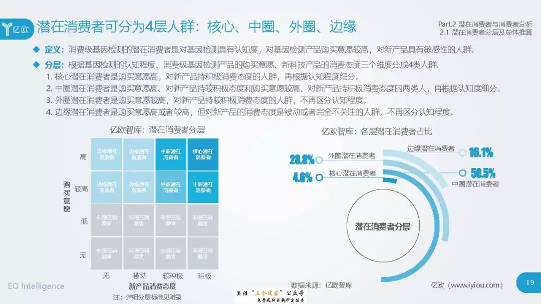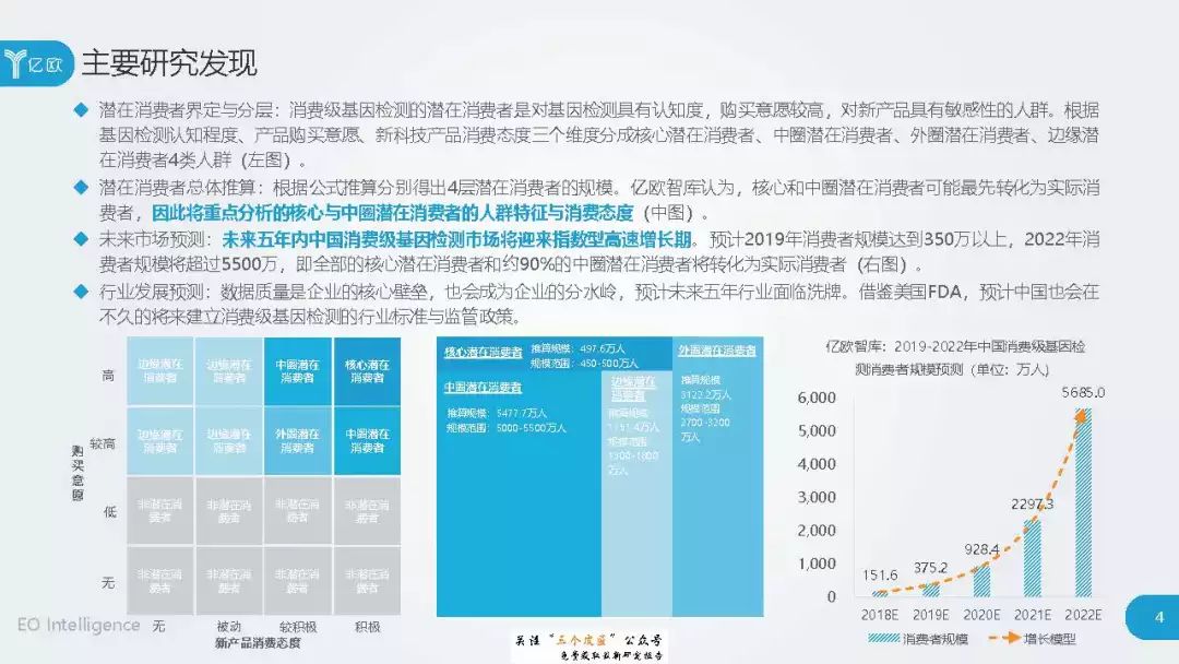 ◆ 潜在消费者界定与分层:消费级基因检测的潜在消费者是对基因检测具有认知度,购买意愿较高,对新产品具有敏感性的人群。根据基因检测认知程度、产品购买意愿、新科技产品消费态度三个维度分成核心潜在消费者、中圈潜在消费者、外圈潜在消费者、边缘潜在消费者4类人群。 ◆ 潜在消费者总体推算:根据公式推算分别得出4层潜在消费者的规模。亿欧智库认为,核心和中圈潜在消费者可能最先转化为实际消费者,因此将重点分析的核心与中圈潜在消费者的人群特征与消费态度(中图)。 ◆ 未来市场预测:未来五年内中国消费级基因检测市场将迎来指数型高速增长期。预计2019年消费者规模达到350万以上,2022年消费者规模将超过5500万,即全部的核心潜在消费者和约90%的中圈潜在消费者将转化为实际消费者。 ◆ 行业发展预测:数据质量是企业的核心壁垒,也会成为企业的分水岭,预计未来五年行业面临洗牌。借鉴美国FDA,预计中国也会在不久的将来建立消费级基因检测的行业标准与监管政策。 |