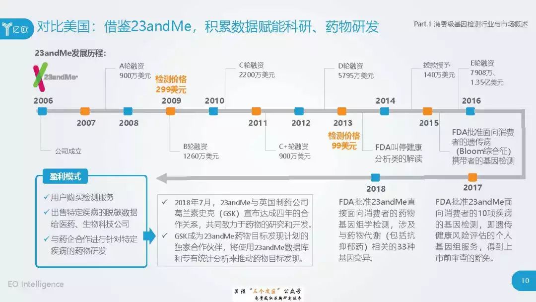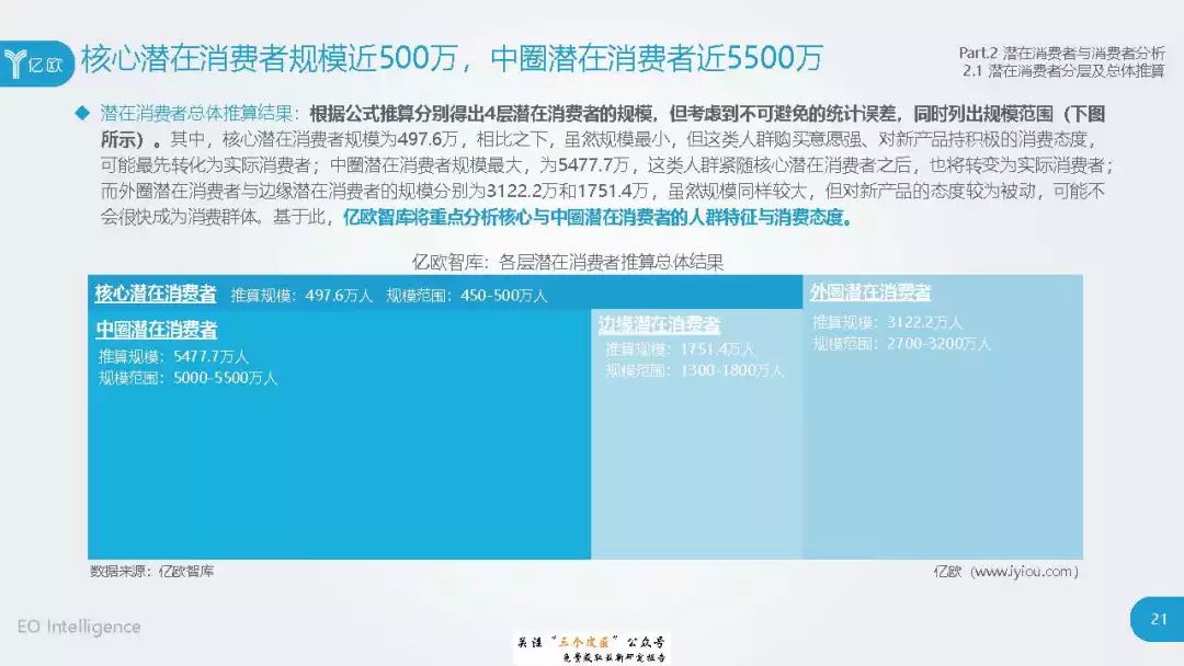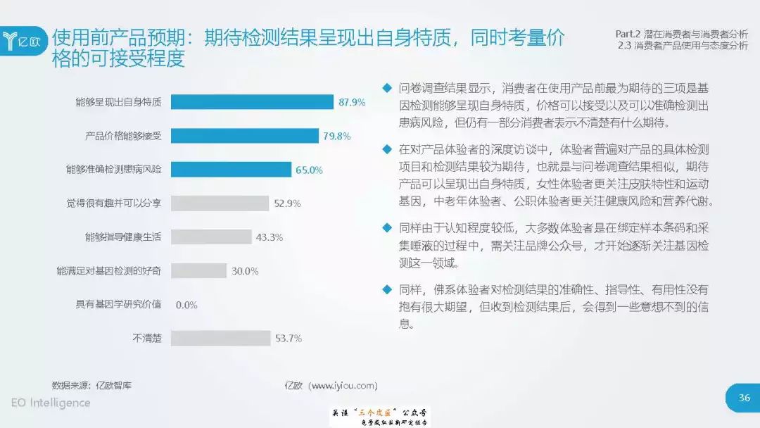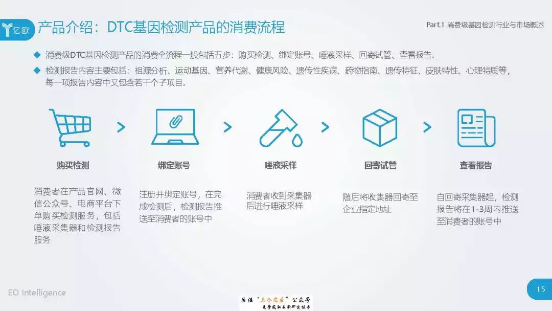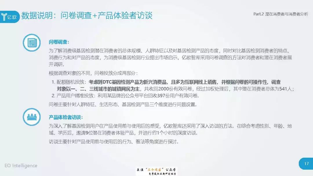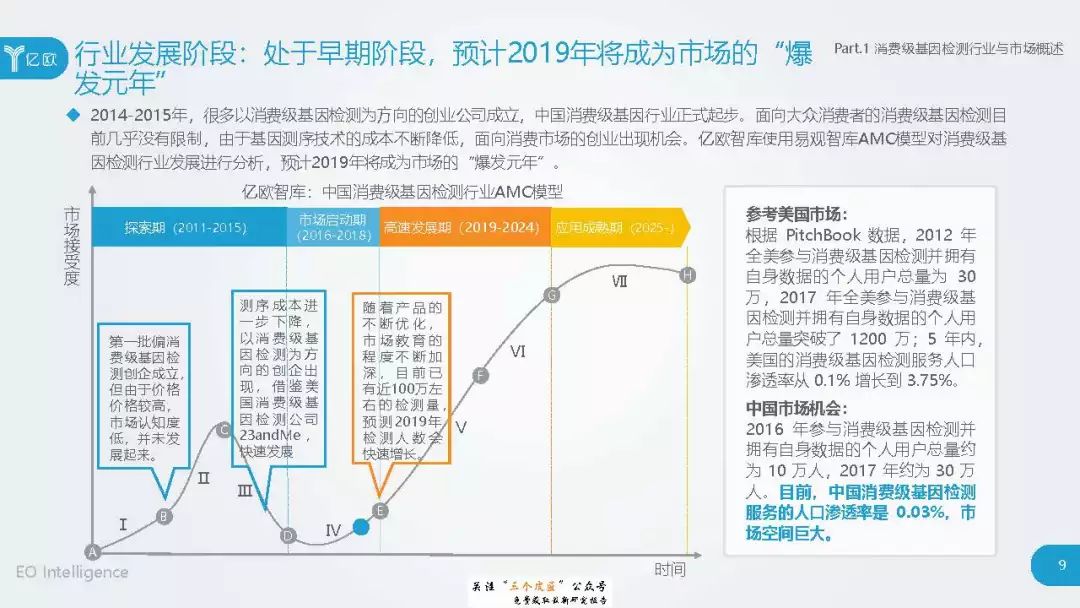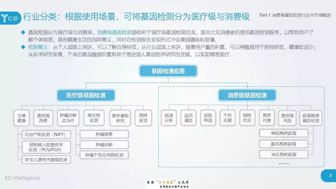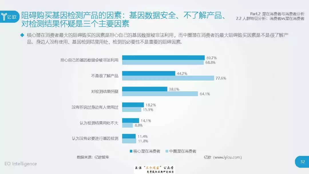 ◆ 潜在消费者界定与分层:消费级基因检测的潜在消费者是对基因检测具有认知度,购买意愿较高,对新产品具有敏感性的人群。根据基因检测认知程度、产品购买意愿、新科技产品消费态度三个维度分成核心潜在消费者、中圈潜在消费者、外圈潜在消费者、边缘潜在消费者4类人群。 ◆ 潜在消费者总体推算:根据公式推算分别得出4层潜在消费者的规模。亿欧智库认为,核心和中圈潜在消费者可能最先转化为实际消费者,因此将重点分析的核心与中圈潜在消费者的人群特征与消费态度(中图)。 ◆ 未来市场预测:未来五年内中国消费级基因检测市场将迎来指数型高速增长期。预计2019年消费者规模达到350万以上,2022年消费者规模将超过5500万,即全部的核心潜在消费者和约90%的中圈潜在消费者将转化为实际消费者。 ◆ 行业发展预测:数据质量是企业的核心壁垒,也会成为企业的分水岭,预计未来五年行业面临洗牌。借鉴美国FDA,预计中国也会在不久的将来建立消费级基因检测的行业标准与监管政策。 |