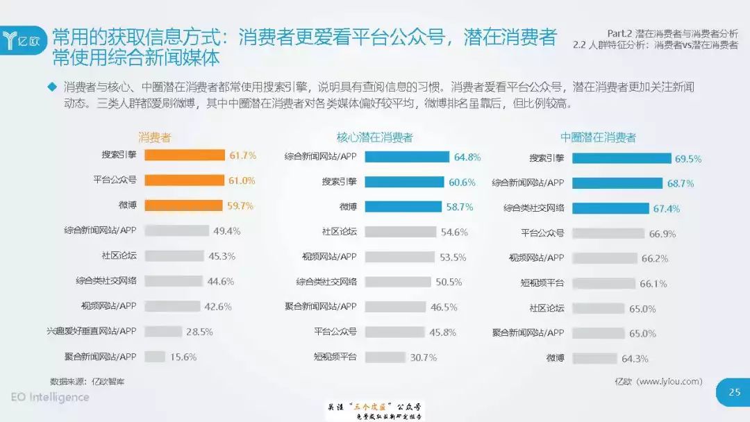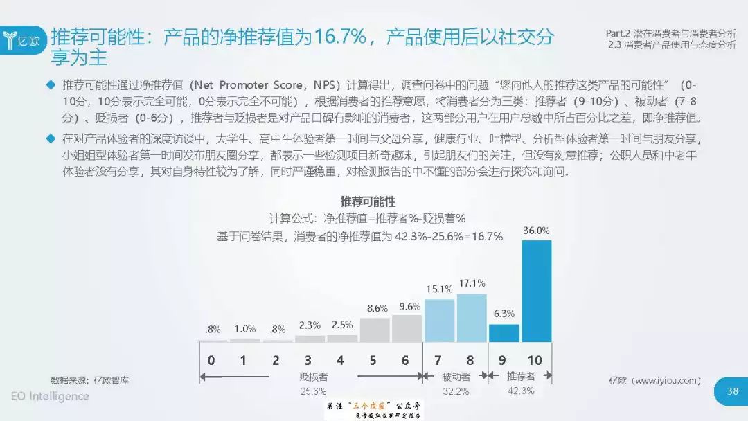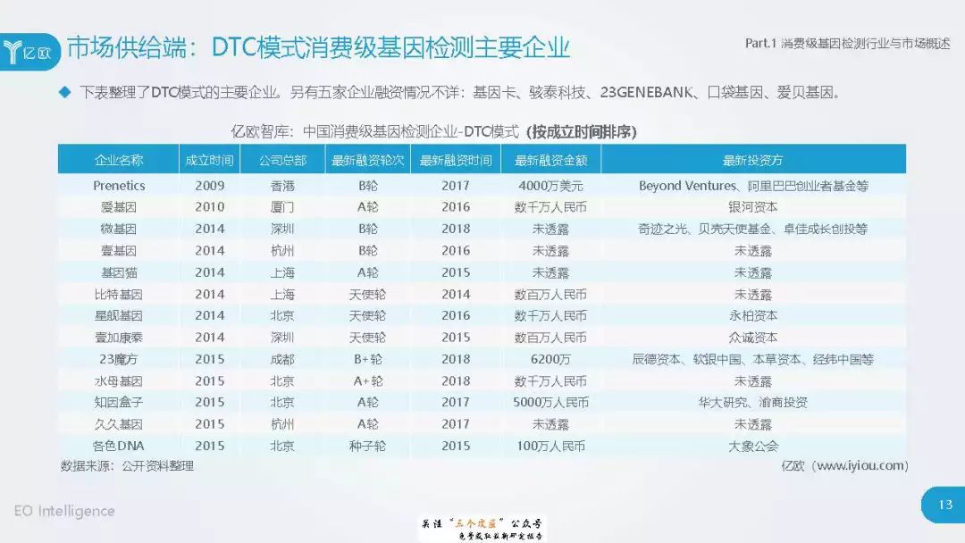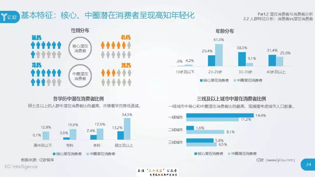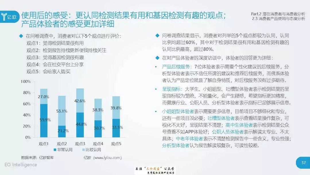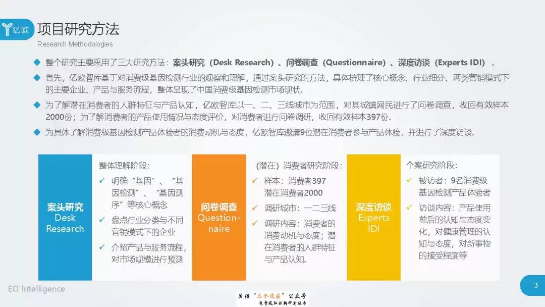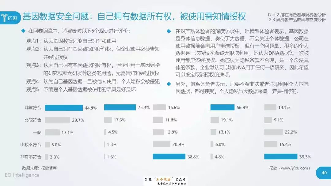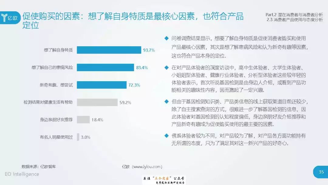 ◆ 潜在消费者界定与分层:消费级基因检测的潜在消费者是对基因检测具有认知度,购买意愿较高,对新产品具有敏感性的人群。根据基因检测认知程度、产品购买意愿、新科技产品消费态度三个维度分成核心潜在消费者、中圈潜在消费者、外圈潜在消费者、边缘潜在消费者4类人群。 ◆ 潜在消费者总体推算:根据公式推算分别得出4层潜在消费者的规模。亿欧智库认为,核心和中圈潜在消费者可能最先转化为实际消费者,因此将重点分析的核心与中圈潜在消费者的人群特征与消费态度(中图)。 ◆ 未来市场预测:未来五年内中国消费级基因检测市场将迎来指数型高速增长期。预计2019年消费者规模达到350万以上,2022年消费者规模将超过5500万,即全部的核心潜在消费者和约90%的中圈潜在消费者将转化为实际消费者。 ◆ 行业发展预测:数据质量是企业的核心壁垒,也会成为企业的分水岭,预计未来五年行业面临洗牌。借鉴美国FDA,预计中国也会在不久的将来建立消费级基因检测的行业标准与监管政策。 |