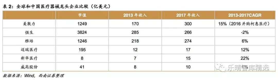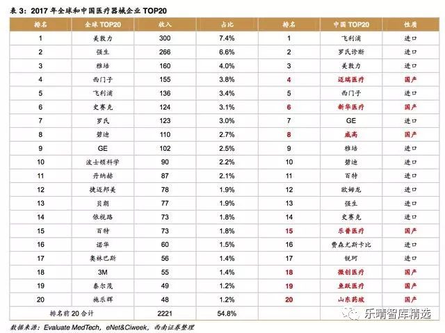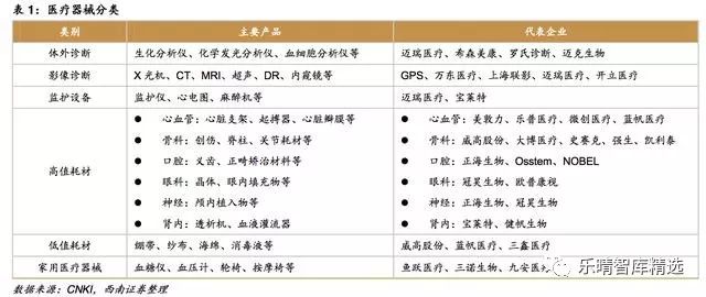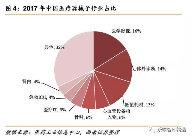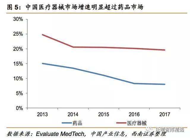 医疗器械是指直接或间接用于人体的仪器、设备、器具、体外诊断试剂及校准物、材料以及其他类似或者相关的物品,包括所需要的计算机软件。医疗器械主要是通过物理等方式实现。 临床应用包括疾病诊断、预防、监护、治疗或者缓解;损伤的诊断、监护、治疗、缓解或者功能补偿;生理结构或者生理过程的检验、替代、调节或者支持;生命的支持或者维持;妊娠控制。 医疗器械是一个多学科交叉产业,除了医学知识以外,还需要生物材料、电子、机械、计算器等相关知识。医疗器械涉及的学科跨度大、技术复杂程度高、品种门类繁多。按照产品特性,医疗器械可分为以下几类: 2017年全球医疗器械市场规模为4050亿美元,同比增长约4%,预计2024年将达到5950亿美元,复合增速约为5.6%。从子行业来看,体外诊断占比仍然最大,其次为心血管、影像设备、骨科。 2017年中国医疗器械市场规模为4425亿元,同比增长20%,超过全球市场增速的4倍。从市场份额来看,医学影像、体外诊断、低值耗材、心血管器械耗材的市场份额靠前。与全球市场相比,中国的骨科、眼科、内镜等市场占比相对偏低。 与全球医疗器械巨头相比,中国医疗器械企业无论是收入还是市值规模都偏小。 2017年全球最大的医疗器械企业美敦力收入达到300亿美元,中国最大的医疗器械企业迈瑞医疗收入仅为17亿美元,仅为美敦力的1/18; 从增速来看,全球巨头由于产品线和区域市场成熟,处在个位数增长阶段,迈瑞仍能凭借内生在2013-2017年期间实现12%的复合增速,还有巨大的成长潜力。 从市值来看,美敦力市值高达1249亿美元,迈瑞仅195亿美元,未来的市值想象空间大。 从行业集中度来看,全球医疗器械市场集中度高,主要由跨国企业巨头占领市场。 2017年全球排名前20的医疗器械企业占全球总销售额的比例达到55%,另外2万多家医疗器械企业的占比仅为45%。 中国医疗器械行业分散,2016年生产企业数量达到15343家,排名前10的企业中有7家跨国企业,排名前20的企业中有13家跨国企业,国产医疗器械进口替代还有巨大的空间。 国产医疗器械尽在生化诊断、心脏支架、骨科创伤、监护仪等少数细分领域实现了进口替代,大多数领域仍然由进口企业占据主导地位,如化学发光、血液分析、内窥镜、超声、骨科关节、起搏器等领域进口占比都超过50%。 中国医疗器械市场增速明显超过药品市场增速,约为药品市场增速的2倍左右。 从医疗器械与药品市场规模相比来看,发达国家基本达到1:1,全球平均水平约为0.7:1,中国市场仅为0.25:1,医疗器械市场还有巨大的成长空间。 中国人均预期寿命持续提高,从1982年的67.80岁提升至2015年的76.34岁。 老龄化进程加快,2017年中国65岁以上老年人数量已经超过1.5亿,占比达到11.4%,而且仍在持续提升。老年人对医疗保健的需求更大,对医学影像检查、体外诊断检查、心脑血管器械、骨科耗材等医疗器械的需求也会持续增长。 医保基金持续保持稳定增长,2017年城乡基本医疗保险基金收入17932亿元,同比增长37%,支出14422亿元,同比增长34%。 随着医保控费、控制药占比、取消药品加成政策的实施,医保基金收入增速实现对医保支出增速的反超。累计结余与当年支出的比例也从2014年最低点83%提升至2017年92%,医保基金的支出安全性进一步提升。 作为医疗服务的主要付费方,医保基金收入和支出的稳定增长也将推动医疗器械市场持续扩容。 推动因素一:大型医用设备配置许可管理权限进一步放开,促进未满足的临床需求放开。 2018年卫健委发布《大型医用设备配置许可管理目录》,将甲类配置证(国家卫健委管理)从12个减少为5个,将乙类配置证(省级卫计委管理)从5个增加为7个(含甲类调整为乙类),许可设备目录减少30%。 由于甲类配置证由国家卫健委负责管理,流程复杂时间长且新增数量受限制,此次调整将PET-CT、内窥镜手术器械控制系统、64排及以上CT、1.5T及以上MR等产品由甲类调整为乙类,能够促进大型医院未满足的需求快速释放。 推动因素二:分级诊疗推动基层医疗机构发展,医疗器械配置需求增加。 国家持续推动分级诊疗,优化医疗资源配置,实现“基层首诊、双向转诊、急慢分治、上下联动”的目标。 基层医疗机构由于预算有限,医疗器械配置不齐全,随着分级诊疗推行,对医疗器械的需求大幅度增加。 尤其是2017年以来原卫计委发文在二级及以上医院建立急诊急救体系相关的5大医疗中心(胸痛中心、卒中中心、创伤中心、危重孕产妇救治中心、危重儿童和新生儿救治中心)建设,各省陆续制定落实方案,未来几年医疗中心数量将会大增,对影像设备、超声、体外诊断产品、心血管/骨科耗材等配套设备的需求也会大增。 近期卫健委发布《全面提升县级医院综合能力工作方案(2018-2020年)》,进一步提升县级医院综合服务能力,力争实现县域内就诊率达到90%左右。 方案提出到2020年,500家县医院和县中医医院分别达到“三级医院”和“三级中医医院”服务能力要求,在当前2439家三级医院的基础上相当于增加21%。 这500家医院将重点加强病理科、医学检验科(临床体液、血液,临床微生物学,临床化学检验,临床免疫、血清学,分子生物学等专业组)、医学影像科(X线诊断、CT诊断、磁共振成像诊断、超声诊断、心电诊断、脑电及脑血流图诊断等专业组)等学科建设,对医疗器械的采购需求将明显提升。 推动