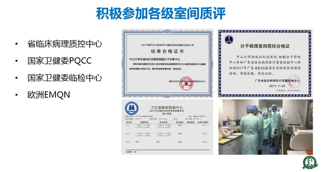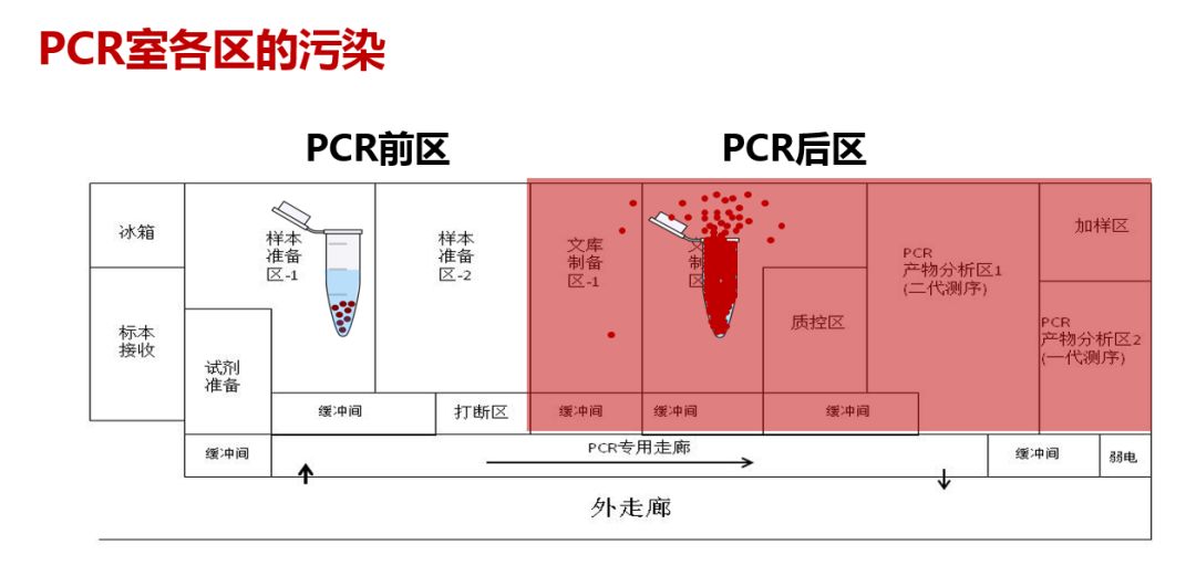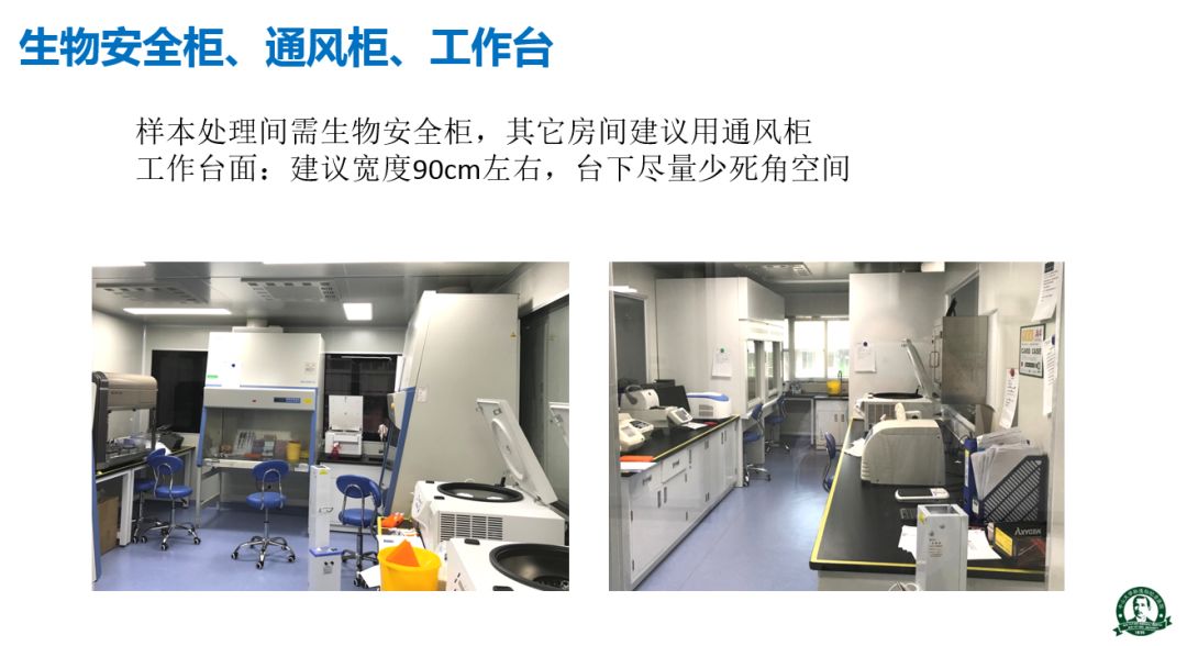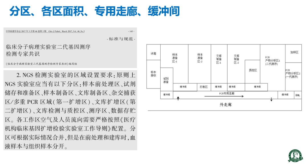 讲者:欧阳能太 教授 地址:中山大学孙逸仙纪念医院 细胞分子诊断中心 •DNA片段主要通过排风清除 •不建议使用内循环的家用空调系统 •暖通空调系统的节能设计 •在保证完成工作的前提下,各区面积应尽量小 •测序仪室独立设置空调系统 •基因测序操作步骤繁多 •分区太多,可能造成操作不方便 •功能区的合理合并 •各项目各步骤合理分配 •使用传递窗 暖通空调系统 (Heating, ventilation & air conditioning, HVAC) –排风:扩增的核酸片段主要靠排风系统清除 –新风:新风与排风保持平衡 •制冷/制热(不循环)、洁净、湿度 –房间压差 –气流方向 •实验室:顶送下排; 专用走廊:单向; 缓冲间:正压/负压 –换气速度:房间全换气一次/5-10分钟 –节能设计 –监控系统 •选择合适的测序仪 –品牌 –型号(通量) •试运行/验证过程复杂,费时、花费大 •必须有强大生信团队支持验证过程 •建立实验操作SOP、室内质控SOP、LDT文件等 •人 病理医师、分子生物学、遗传学、检验,专业培训 •机 PCR仪、测序仪等 •料 合格的试剂与耗材 •法 NGS、MLPA、Sanger、SOP、LDT •环 合格的PCR室:分隔、气流方向、压差、温度、湿度 •评 参加室间质评(PQCC、省分子病理质控、EMQN)