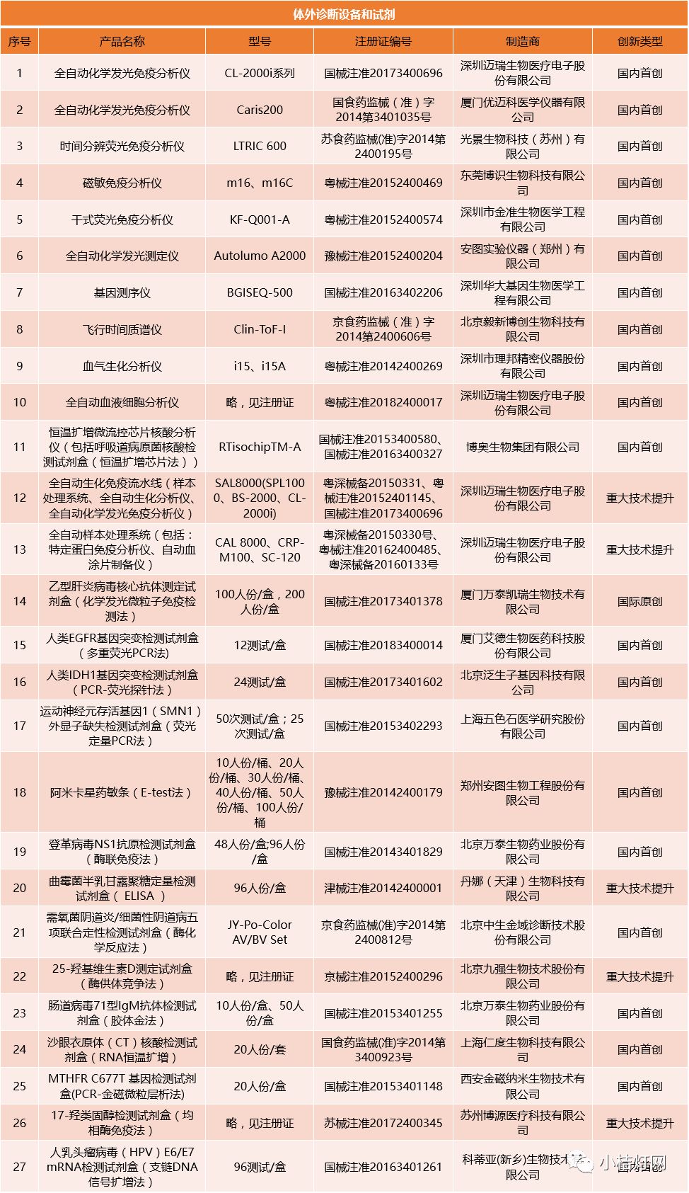 近日,科技部社会发展科技司发布了《创新医疗器械产品目录(2018)》公示,根据公示的公告,共遴选出87个创新医疗器械产品,其中体外诊断产品27个。按单个产品计算,目录共有一类医疗器械产品2个,二类医疗器械产品15个,三类医疗器械产品15个,包括18个设备产品和13个试剂产品。