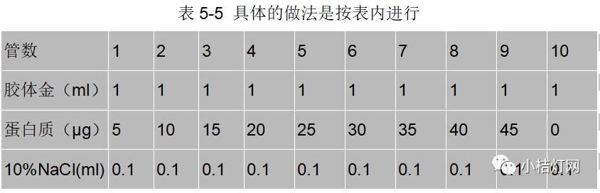 (2)目测法:将待标记的蛋白质逐级稀释后,各取等体积顺序加入一系列装有1ml胶体金(已调节好pH值)的试管中混匀(由5μg~45μg,另设对照管),5min后,在上述各管内分别加入0.1ml 10%氯化钠,依表5-5顺序进行。