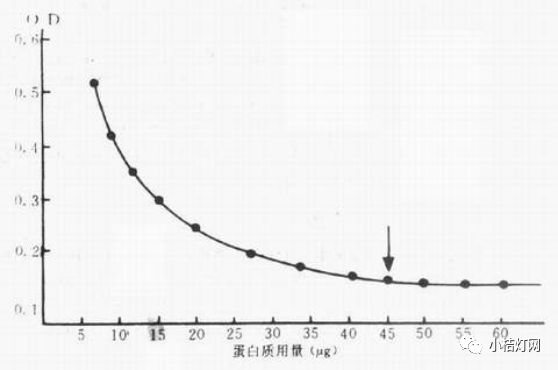 (1)光电比色法:制备一系列不同浓度的等体积蛋白质溶液,分别加入5ml胶体金(已调节好pH值)中,迅速混匀,然后各加入1ml 10% NaCl溶液,摇匀,静置5min后测各管。根据胶体金颗粒的大小,OD在最高吸收峰进行测定,以OD值为纵坐标,蛋白质用量为横坐标作一曲线,取曲线最先与横轴相接近的那一点处的蛋白质用量为最适稳定量。图中10nm的胶体金溶液中蛋白质的最适稳定量为45μg/ml。