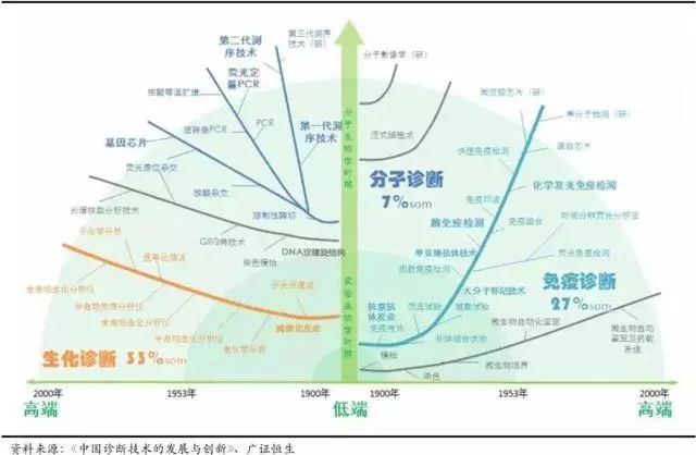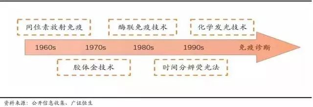 单就免疫诊断一个领 域来讲,就经历了放射免疫分析技术(RIA)、免疫胶体金技术、酶联免疫分析技术(ELISA)、时间分辨 荧光免疫分析技术(TRFIA)和化学发光免疫分析技术(CLIA),每一次技术的更新都会对检测的灵敏度 以及准确性带来相应的提高,同时新技术的开发也会对过去技术以及产品产生迅速的颠覆以及替代。