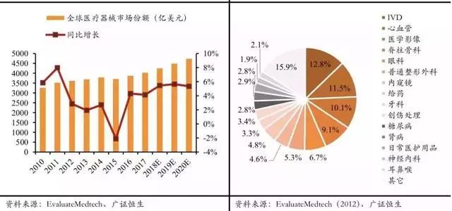 其中市场规模最大的 5 个领域 IVD、心血管、医疗影像、脊柱骨科以及眼科领域的市场份额合计占比约为 50%。同时,医械市场增长率维持在 4%左右,医械市场尤其是发达市场基本处于成熟阶段,当“巨人”越长越大时,对空间的渴求也就更加强烈。