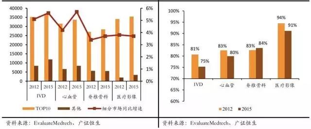 另外在竞争格局上,经过数十年的发展,全球医疗器械市场已经高度集中,特别是在主要的 IVD、心血管、脊椎骨科以及医疗影像的细分领域 CR10 均超过了75%,其中的主要企业基本已经到达其业绩的天花板。