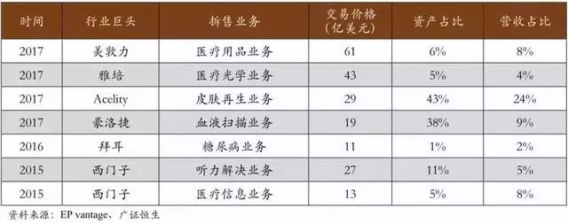 近几年医械巨头美敦力、雅培以及西门子分别对其医疗用品业务,光学医疗业务以及医疗信息业务进行了拆售。特别是 2017 年,在 TOP10 并购案中,就有 4 项是关于行业巨头的业务拆售。