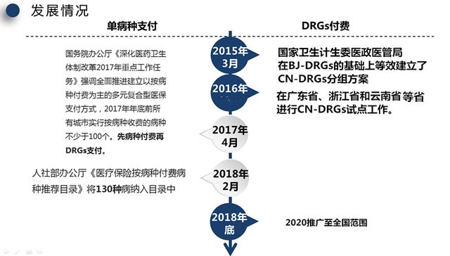 1、单病种付费 单病种付费是指对一个不含合并症和并发症、相对独立单一的疾病进行诊疗全过程的独立核算和费用总量控制,并制定出相应的付费标准,医保部门按标准向医疗机构支付费用的一种方法。 2、DRGs支付 DRGs支付指的是首先综合考虑患者年龄、性别、住院天数、临床诊断、病症、手术、合并症与并发症等情况,将临床过程相近、费用消耗相似的病例分到同一个DRG病组,在DRGs分组的基础上,通过科学的测算制定出每一个组别的付费标准,并以此标准对医疗机构进行预先支付的一种方法。 二、应用发展概况