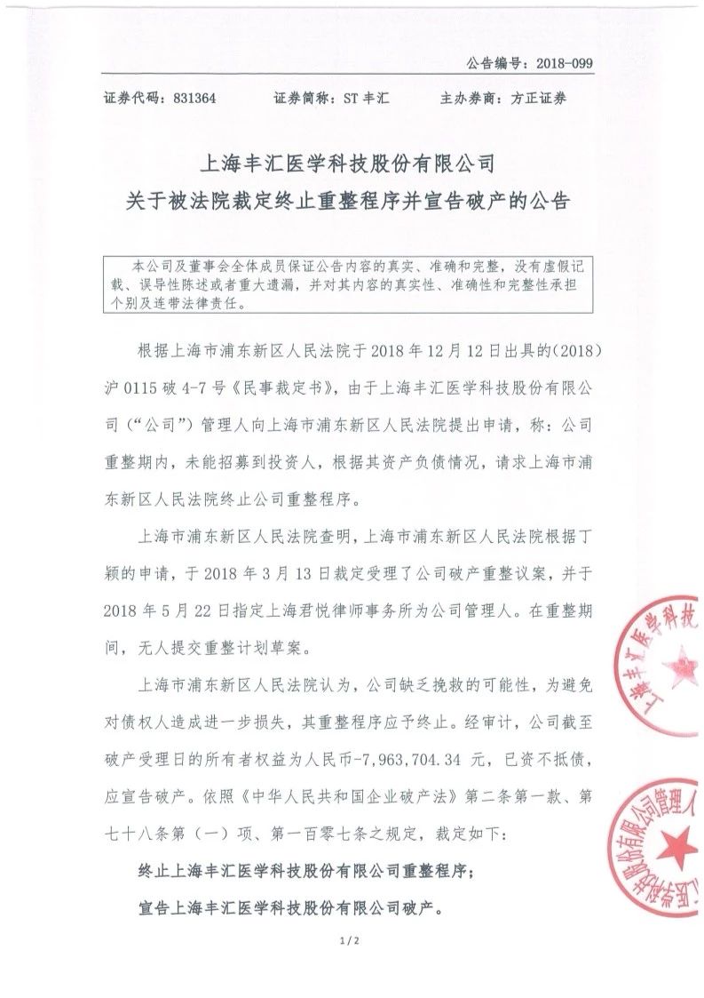 上海《方案》发布的同时,福建省卫健委也发布《福建省卫生健康行业作风整治专项行动实施方案》。 预计接下来,从上海开始,在整个12月和接下来的1月,全国各省将相继开启最严的集中整治模式。全国医疗行业纠风整治最为紧张的时期到来!同时2018年也是各类IVD集采和打包项目最为集中的节点 05 优胜劣汰,破产已然发生 12月14日,中国出现了第一家IVD上市企业宣告破产——上海丰汇医学科技股份有限公司发布《关于被法院裁定终止重整程序并宣告破产的公告》。 成立于1997年的上海丰汇医学科技股份有限公司,于2014年11月19日在新三板挂牌。主营业务为体外诊断试剂的研发、生产及销售。产品包括FH系列全自动生化分析仪和新开发的免疫化学发光类精密分析仪器以及60余种体外诊断试剂。