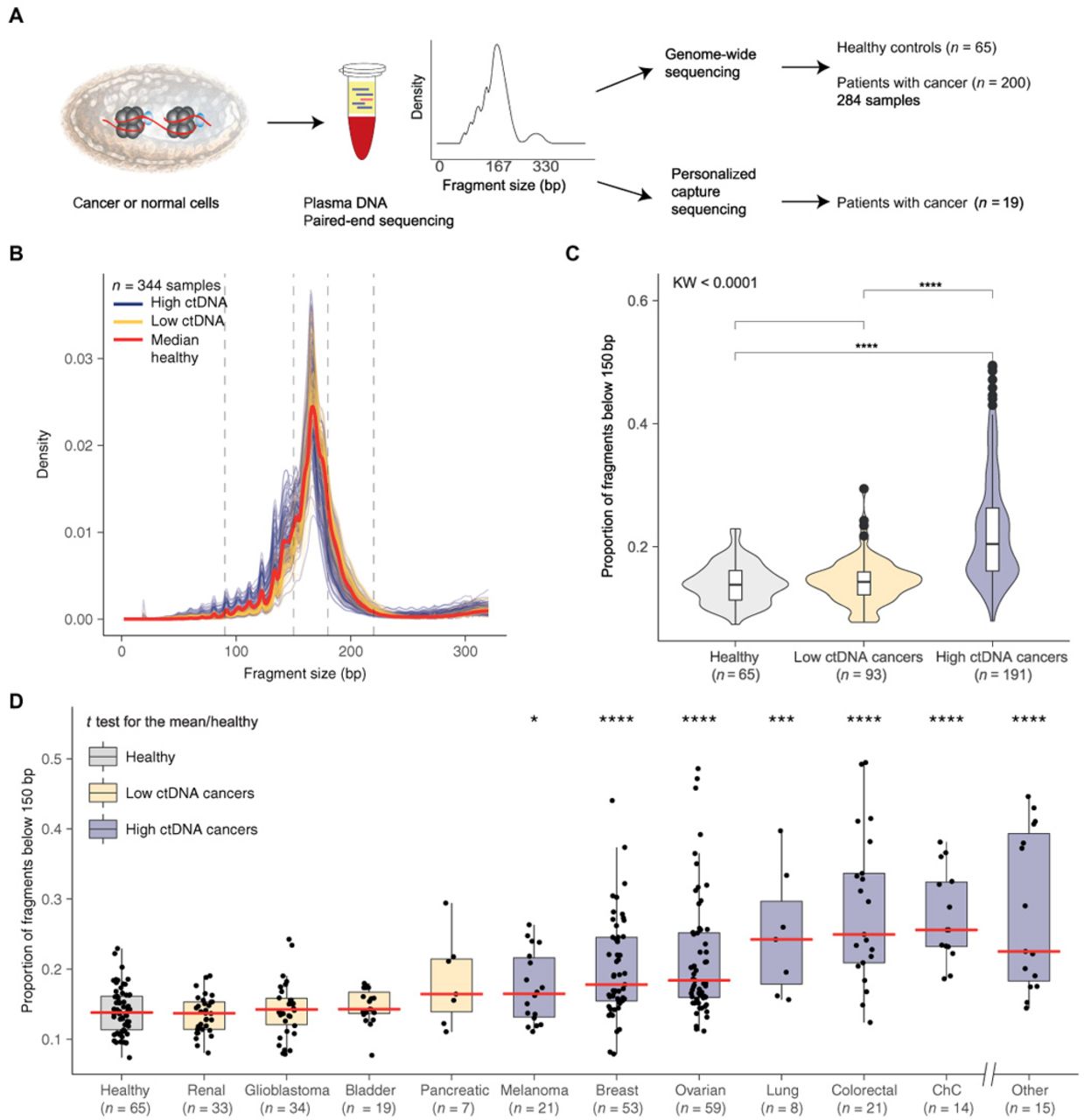 液体活检是通过直接检测CTC、ctDNA、外泌体等来获得癌症患者的基因突变信息。但这项技术也存在一定的局限性,如癌细胞释放的ctDNA多数未发生突变,或者发生了罕见突变难以识别,为检测的准确性和精确性带来了极大的挑战。从近期的研究报道来看,液体活检的部分研究开始集中在通过检测DNA片段大小、表观遗传修饰和其他特征,以探索如何在不识别特定突变的情况下,从血液样本中检测出癌症信息。研究成果表明,多个新方法既可以作为肿瘤DNA突变检测的辅助手段,使癌症检测更加容易和廉价,也有足够的敏感度作为独立的肿瘤检测手段。 基于DNA片段大小识别癌症患者2018年11月,在发表于Science Translational Medicine的一项研究中,英国癌症研究所(CRUK)和剑桥大学科学家领导的研究团队描述了一种新开发的DNA检测方法,该方法能够依据血液中DNA片段的大小富集ctDNA进行分析,区分癌症是否存在。 此前研究表明,孕妇血液中可检测到胎儿较短的cfDNA片段。受此启发,该研究小组采用全基因组测序方法,对癌症患者血浆的ctDNA片段大小进行检测分析,以确定肿瘤与正常DNA的阈值。研究发现,cfDNA片段化不是随机的,而是与循环细胞释放DNA的方式有关。与血浆中的背景DNA片段相比,ctDNA分子的尺寸较小(图1C)。因此,人们可通过鉴别片段大小增强检测信号。