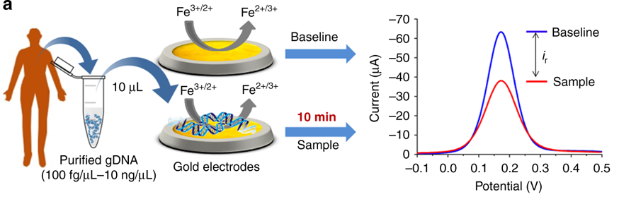 图2. 金电极DNA吸附的电化学定量方法研究 DNA甲基化可导至癌症基因组和正常基因组之间DNA溶解和金亲和力方面的差异。在该研究中,研究人员利用这些生物学差异创建了简单的电化学一步分析法。该方法可在10分钟内完成样本分析,样本需求量小,是一种低成本、低样本量的肿瘤检测新方法。 目前,该研究团队已经对来自不同癌症类型的200个样本及健康对照进行检测,准确率高达90%。研究人员表示,该电化学分析方法已经申请了知识产权保护,目前正在寻找适当的样本,测试其发现早期癌症的能力。研究团队计划将该方法与其他互补方法结合,如检测点突变或其他生物标记物等,以弥补技术的局限性。 其他新检测方法同时,也有其他研究团队关注全基因组甲基化或DNA片段大小研究。今年10月份,香港中文大学卢煜明教授在PNAS上报告了一种通过分析循环DNA片段的末端坐标来检测癌症的方法。卢煜明教授表示,CRUK的研究与其团队此前的研究路线一致。CRUK的研究成果提供了新证据,证明分析DNA片段大小在多种癌症类型的大样本队列研究中是有效的。