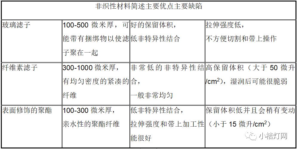 2.1膜对于免疫层析试剂条可能是最为重要的材料,必须可以在检测线和质控线处不可逆地结合捕获性试剂。具有代表性的膜和它们的结合特性见下表: