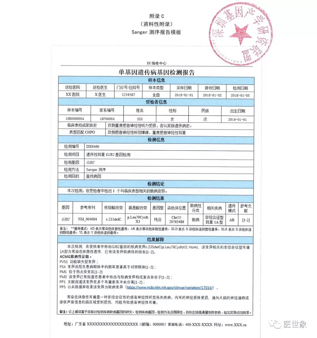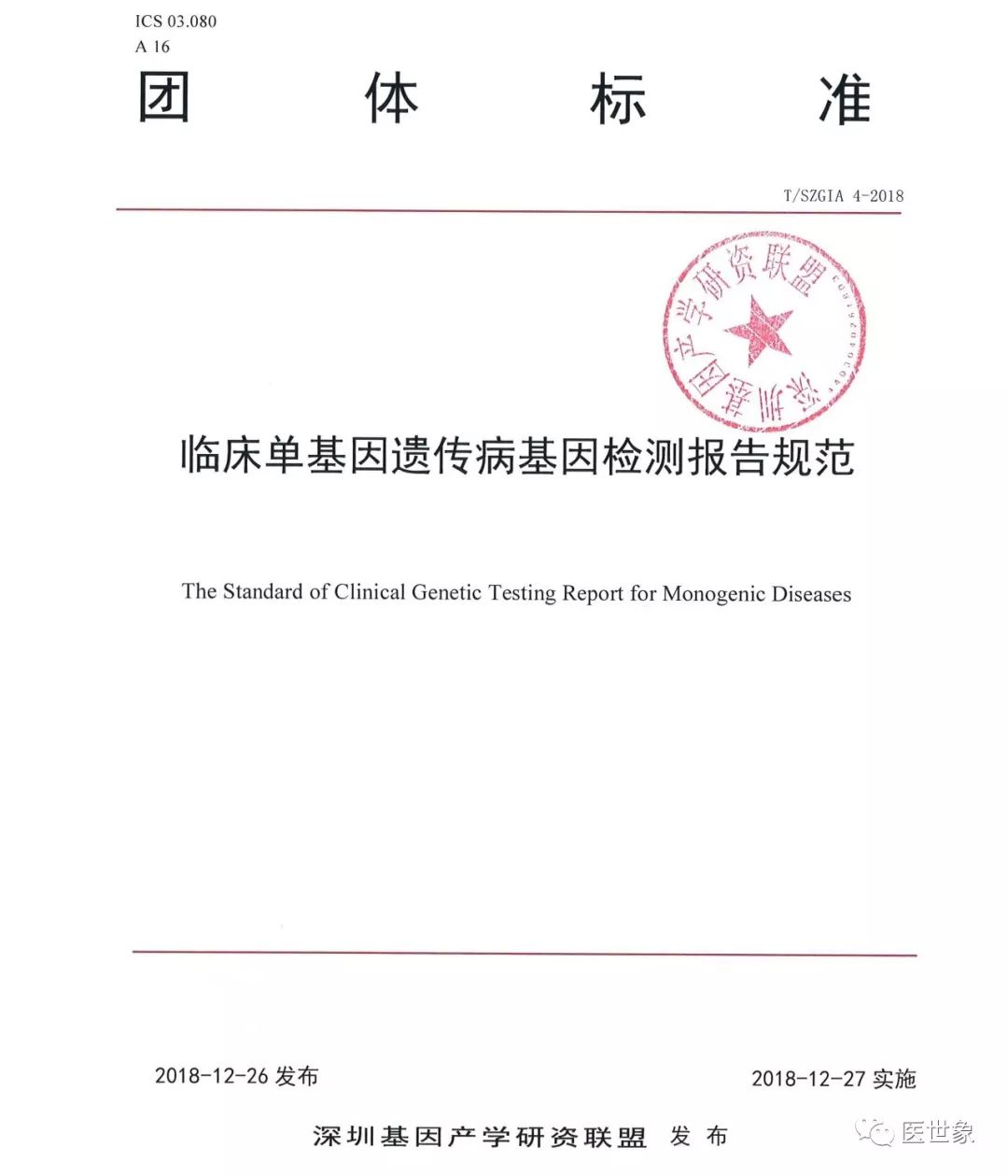 2018年12月26日,深圳基因产学研资联盟发布《临床单基因遗传病基因检测报告规范》团体标准,该标准由深圳华大基因股份有限公司、深圳基因产学研资联盟等21家单位,黄尚志、顾卫红、沈亦平、孙洪业、于世辉、朱宝生等55位基因领域 KOL 联名起草。并于2018年12月27日开始实施。 该标准规定了临床单基因遗传病基因检测报告应包含的内容以及要求,适用于第三方医学检验机构、医院或大学诊断实验室等出具的临床单基因遗传病基因检测报告。 《临床单基因遗传病基因检测报告规范》团体标准的具体内容如下:(点击查看高清图片) |