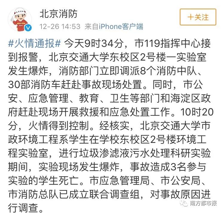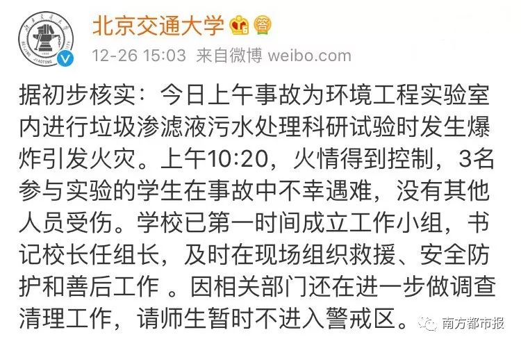 与实验室安全相关的话题永远不过时 实验室区域行为规范有哪些? 化学品要如何储藏与保管? 有机溶剂如何使用? 这些问题备受关注。 今日,北京交通大学一实验室爆炸,3名学生死亡的消息让痛心。据“北京消防”消息。上午10时20分现场火情得到控制。经核实,北京交通大学市政环境工程系学生在学校东校区2号楼环境工程实验室,进行垃圾渗滤液污水处理科研实验期间,实验现场发生爆炸,事故造成3名参与实验的学生死亡。目前,北京市应急管理局、市公安局、市消防总队已成立联合调查组,对事故原因进行调查。图据央视新闻 北京交通大学官方微博也在下午3时发出通报: