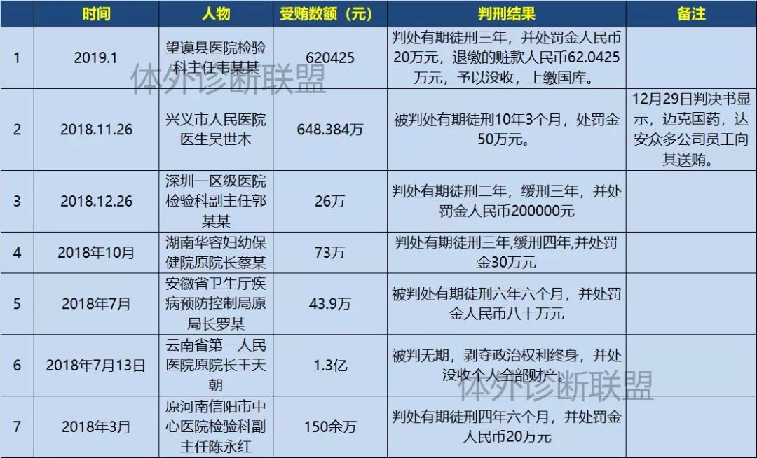 一、十年受贿六十万! 又一检验科主任获刑三年! 十年累计收受贿赂60多万元,2019年1月初,望谟县医院检验科主任韦某某涉嫌受贿罪一案日前在望谟县法院公开开庭审理。 在2007年至2017年期间,被告人韦某某利用其担任望谟县医院检验科主任的职务便利,在望谟县医院检验科采购检验试剂方面为医疗用品供应商谋取利益,多次非法收受医疗用品供应商杨某、温某、舒某等9人贿赂共计620425元,犯罪数额巨大,且作案时间持续长达十年之久,犯罪情节尤为严重,对社会造成了恶劣影响。 庭审中,法庭充分保障被告人各项诉讼权利,公诉机关就指控犯罪证据进行当庭电子举证,被告人、辩护人充分发表质证意见。经过庭审调查、举证质证、法庭辩论,以及被告人最后陈述,合议庭根据公诉人所例举的证据和辩论过程中的争议焦点问题,合议后做出综合评判,并当庭宣判被告人韦某某犯受贿罪,判处有期徒刑三年,并处罚金人民币20万元,退缴的赃款人民币62.0425万元,予以没收,上缴国库。 无独有偶,同样是在黔西南,兴义市人民医院医生吴世木在任检验科副主任、主任期间,先后78次收受贿赂共计648.384万元,被判处有期徒刑10年3个月。 根据12月29日的裁判文书网显示,2004年4月至2018年2月,吴世木在任兴义市人民医院、兴义市人民(工人)医院检验科副主任(主持工作)、住院部检验科(检验二科)主任、医学检验科主任期间,利用申报采购、审核验收相关试剂耗材和医疗器械的职务便利,为贵州迈克科技有限公司马某、李某1,贵州玛诺单采血浆有限公司、贵州玛诺医疗器械有限公司、贵阳华庆医疗器械有限公司、贵州彻烨贸易有限公司陈某1、时某1、时某2、申某,贵阳恒兴盛商贸有限公司、中国医疗器械贵州有限公司、国药集团(贵州)黔西南州医疗器械公司李某2、张某、阮某,四川亚中医疗仪器有限责任公司黄某,贵州兴盛源医疗设备有限公司、贵州开元医疗设备有限公司周某,贵州博创兴科生物工程技术有限公司徐某,昆明佰康科技有限公司刘某,中山大学达安基因股份有限公司程某等医疗设备及耗材供应商谋取利益,收受上述人员以销售给兴义市医院耗材等金额5%至15%回扣及感谢费名义送的贿赂共计648.384万元。 2006年至2018年3月期间,兴义市余元共计向贵州迈克科技购买器材及耗材共计付款4767.47万元。迈克科技的李某证词中表示,在向兴义市医院供应相关医疗器械、试剂等耗材过程中,按照5%至8%不等的比例给过吴世木回扣,共分9次送给吴世木260万元。 2008年11月,达安基因与兴义市医院签订购买荧光定量PCR仪一台的合同,价格18万元;2009年至2018年兴义市医院与达安基因的试剂耗材合作金额至少为298.82万元。达安基因员工程某证词表示,吴世木作为检验科主任,对选择设备及试剂耗材有绝对的话语权,最终兴义市医院采购了达安基因的设备,为感谢他于2009年5月送给其4万元。 阮某证词显示,贵阳恒兴盛公司、中国医疗器械贵州公司、国药集团黔西南公司在兴义市医院的业务其实就是一家公司的业务,其在这三家公司任职期间,分7次送给吴世木57万元。 检察机关表示,吴世木如实供述办案机关掌握收受李某2贿赂8万元及张某贿赂14万元外,主动供述了办案机关未掌握的收受626.384万元的事实。案发后,所得赃款已全部退清。 2018年3月19日,因涉嫌犯受贿罪吴世木被兴义市监察委员会采取留置措施,7月17日经兴义市人民检察院决定并于同日执行逮捕。 2018年11月2日,贵州省兴义市人民检察院指控吴世木犯受贿罪,向兴义市人民法院提起公诉。法院于2018年11月29日公开开庭审理了本案。 法院认为,吴世木在任兴义市人民医院检验科副主任、住院部检验科主任、医学检验科主任期间,利用申报采购、审核验收相关试剂耗材和医疗器械的职务便利,为医疗设备及耗材供应商谋取利益,78次非法收受他人贿赂648.384万元,构成受贿罪,判处有期徒刑10年零3个月,并处罚金50万元。 2018年12月26日,罗湖区人民法院以受贿罪判处原罗某区人民医院检验科主任,现任某区人民医院检验科副主任郭某某有期徒刑二年,缓刑三年,并处罚金。据判决书显示,郭某某多次利用职务上的便利为他人谋取利益,并收受他人贿赂共计26万元。 深圳市罗湖区人民检察院指控,被告人郭某某自2009年至2013年担任深圳市罗某区人民医院检验科主任以及2017年1月,全面主持某某区人民医院检验科工作期间,利用职务上的便利,为他人谋取利益,具体犯罪事实如下: 收受深圳市瑞某康科技有限公司崔某(另案处理)所送贿赂20万人民币,为该公司的HPV试剂、第三方质控品及乙肝两对半试剂这些产品在罗某区人民医院引进及使用提供帮助。 收受深圳市诺某盛医疗器材有限公司郭某(另案处理)所送贿赂3万元人民币,为该公司提供相关采购信息,后该公司成功中标罗某区人民医院血凝分析仪采购项目。 2017年1月,被告人郭某某全面主持某某区人民医院检验科工作期间,C反应蛋白试剂供应商林某到其办公室,请求被告人为医院继续使用他们公司的产品并给予关照,郭某某允诺,并收受林某送给其的3万元人民币现金。 2017年6月13日,郭某某在单位监察科陪同下到福田区人民检察院投案,并如实交代了其受贿事实。审查起诉阶段,郭某某退赃260000元人民币。 最终,罗湖法院审理认为,被告人郭某某无视国家法律,利用职务上的便利,非法收受他人财物,数额巨大,其