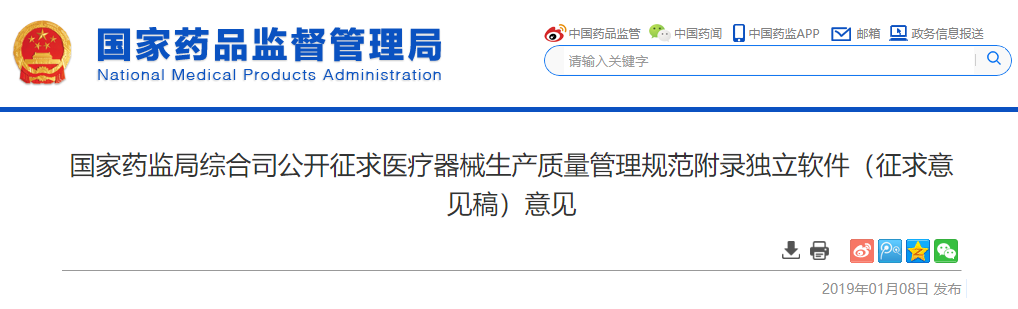 为强化软件类医疗器械产品质量管理,国家药品监督管理局组织编写了《医疗器械生产质量管理规范附录独立软件(征求意见稿)》,现公开征求意见。请将相关建议和意见于2019年1月30日前以传真和电子邮件形式反馈。