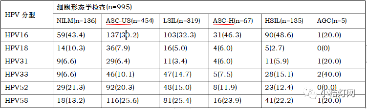 上表数据说明:HPV16型是最常见型别。在ASC-US,LSIL和HSIL中HPV58型仅次于HPV16型;在HSIL中HPV33型和HPV52型接近,分别为第3和第4;在NILM中HPV52型仅次于HPV16型。HPV18型相对较少。