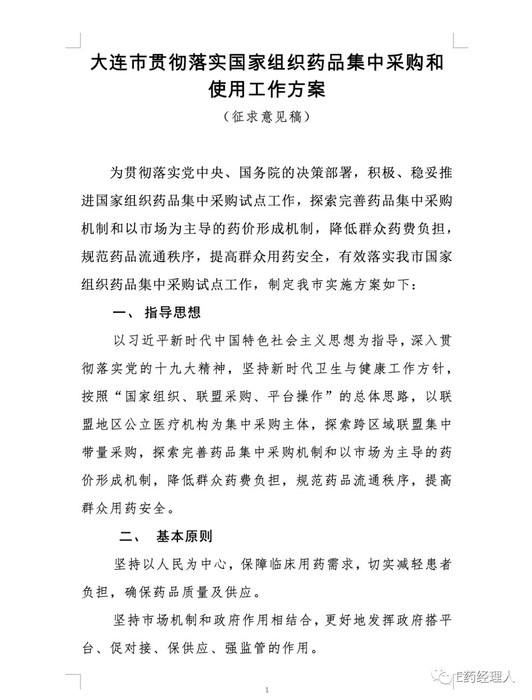 近日,E药经理人从业界获悉,4+7试点城市之一的大连市,日前已经率先公布了《大连市贯彻落实国家组织药品集中采购和使用工作方案》(征求意见稿)。