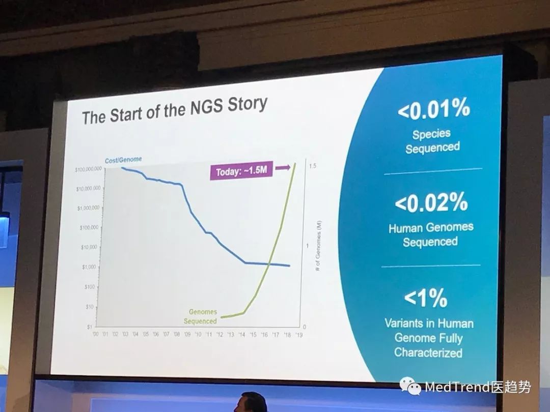 Illumina计划在2019年第一季度为其NovaSeq仪器推出新芯片,并升级到iSeq测序仪。计划中的NovaSeq SP芯片将具有“最快的运行时间,最低的运行成本和最长的读取时间”。 Illumina正逐步进入临床领域。Illumina CEO Francis DeSouza表示,继去年8月NMPA批准MiSeqDx后,Illumina正与中国伙伴合作,让MiniSeq也获得监管许可。目前,它正与KingMed Diagnostics合作进行肿瘤学研究,并与另一家中国公司合作治疗遗传性疾病。 llumina已经推出了TruSight Oncology 500检测的研究版本,并正在努力开发临床版本。这种全癌种检测产品能够检测肿瘤突变负荷和微卫星不稳定性——这些生物标志物越来越被认为对免疫治疗反应很重要。 在生殖健康业务方面,Illumina计划在今年上半年推出VeriSeq NIPT测定的第二版。此检测将扩展到评估整个基因组范围内的非整倍体,而不仅仅是21三体、18三体、13三体和性染色体异常。 公司估计,到2019年,收入将增长13%~14%,达到37.6亿美元至38亿美元之间。 此外,Illumina还将继续100美元基因组的开发,但没有提供关于何时交付的暗示。同时,将按计划在2019年中期完成以12亿美元收购PacBio。 ▲deSouza提出他对Illumina技术如何实现新的可能性的看法 ▲Illumina在大会上讨论了NGS的潜力 美敦力CEO Omar Ishrak