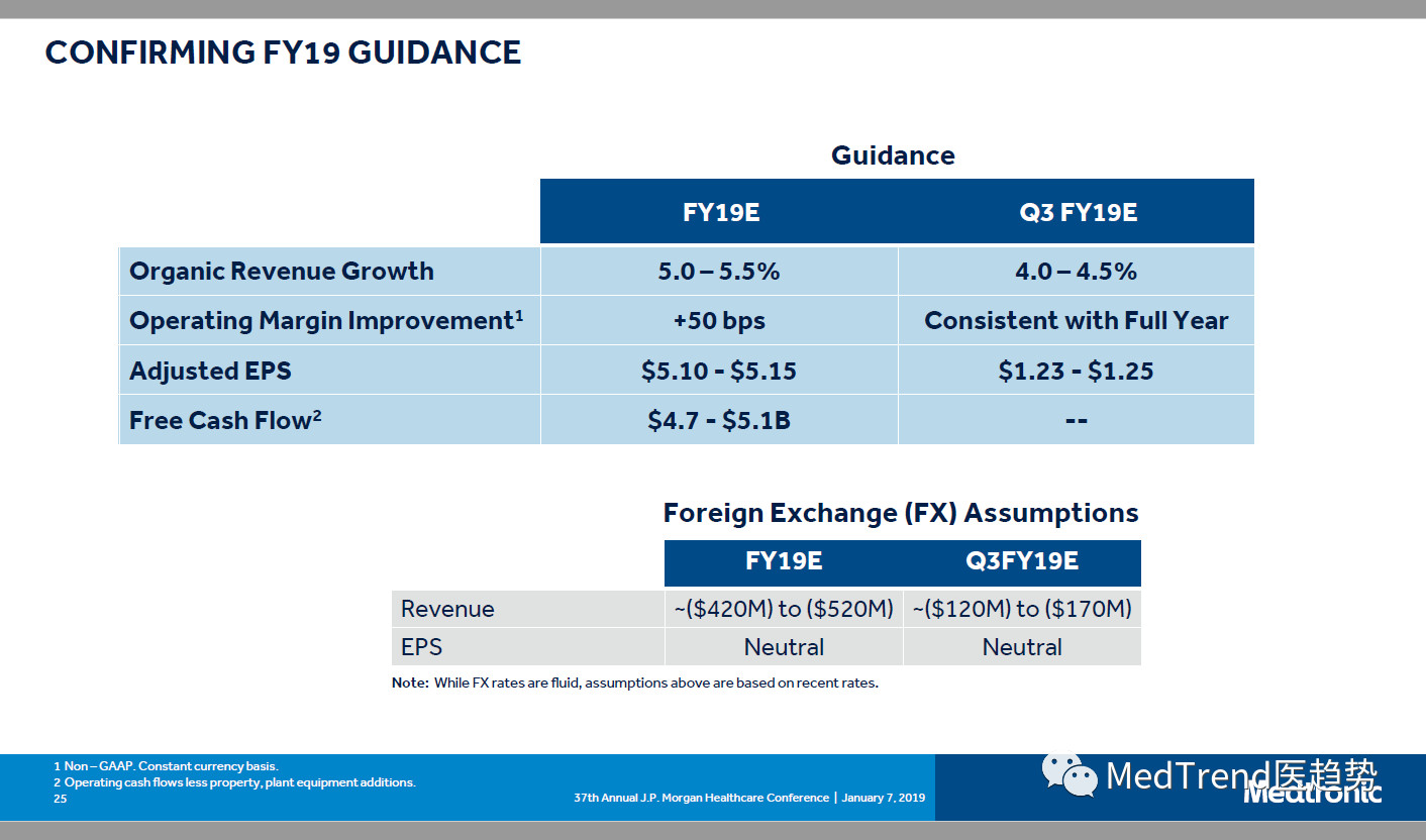 Ishrak表示,美敦力的产品线“一如既往地强劲,而且更加强劲”,并强调美敦力最近发布的产品,如用于脊柱手术的Mazor X隐形版机器人,是该公司的新兴增长点。领导层认为,微创治疗组和恢复性治疗组在抵消税收法规、国际关税以及心血管和糖尿病领域日益激烈的竞争等公司控制之外的因素方面表现强劲。 ▲美敦力CEO(左) ▲美敦力2019财年预期 波士顿科学CEO Mike Mahoney