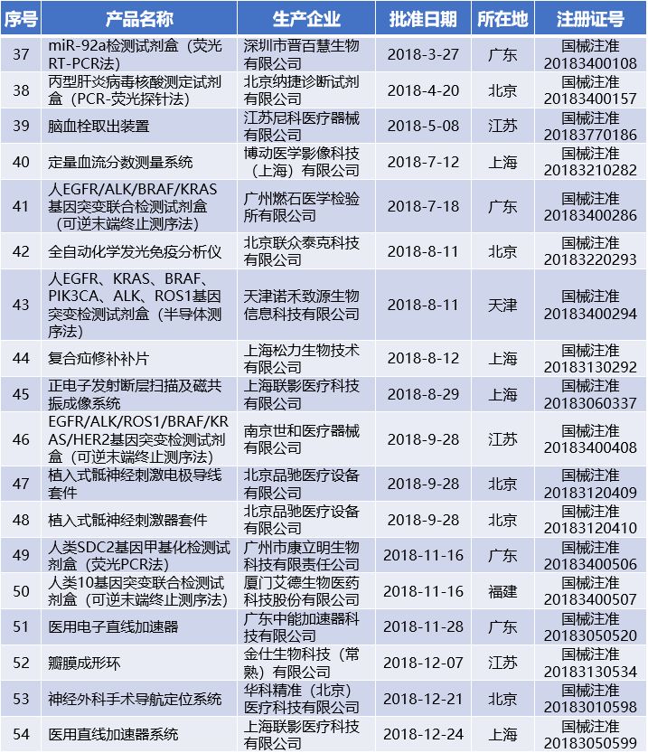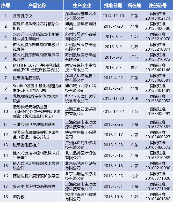 2019年01月11日 发布 近年来,国家药监局贯彻落实《国务院关于改革药品医疗器械审评审批制度的意见》(国发〔2015〕44号)和《中央办公厅国务院办公厅关于深化审评审批制度改革鼓励药品医疗器械创新的意见》(厅字〔2017〕42号),深入推进医疗器械审评审批制度改革,加速医疗器械创新发展。自《创新医疗器械特别审批程序》发布以来,截止2018年12月31日,已有197个产品进入创新医疗器械特别审查通道,批准神经外科手术导航定位系统、正电子发射断层扫描及磁共振成像系统等54个产品注册,一批创新性强、技术含量高、临床需求迫切的创新产品上市,填补了相关领域的空白,更好的满足了人民群众的健康需求。 从批准产品所在地来看,产业大省创新医疗器械数量排名靠前,分别是北京18个、上海10个、广东10个、江苏8个。从批准产品的类型来看,植入类医疗器械22个,诊断类设备9个,体外诊断试剂13个。 国家药监局已批准的创新医疗器械 (共54个产品) (摘自 国家药品监督管理局) |