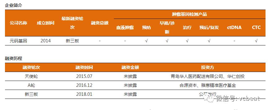 优迅医学是市场中少数提供血液肿瘤基因检测的公司之一。在血液肿瘤基因检测大多使用PCR试剂盒的情况下,优迅医学着眼未来,开发了基于NGS技术的血液肿瘤检测产品。使用NGS进行血液肿瘤融合基因、点突变及个性化微残的检测,相比于传统的PCR技术,可以为患者提供更全面的检测结果,实现更加精准的预后分析,并提供更加有效的治疗方案。 2.元码基因 元码基因2014年在北京成立,曾在2015年和2016年进行过天使轮和A轮的融资,投资方包括华人创投、合源资本、雅惠精准医疗基金等,具体融资额未披露。2018年1月,元码基因在新三板上市。