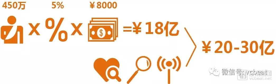 不以肿瘤基因检测为主营业务的公司,不代表其肿瘤基因检测相关业务水平差。这一类企业中也有像华大、贝瑞、安诺优达这样赫赫有名的基因检测企业,其肿瘤基因检测方面的业务水平不输很多主营肿瘤基因检测的公司。这些公司在肿瘤基因检测行业中同样占有一席之地,只是其发展历程和融资情况并不能很好的代表肿瘤基因检测行业的发展状况。 八.肿瘤基因检测行业市场规模 图13:2018年肿瘤基因检测行业市场规模 从目前的市场角度上看,治疗阶段的肿瘤基因检测产品作为目前的刚需产品,其市场规模较为稳定,并且也相对容易测算。2018年全年我国预计会有450万人新发恶性肿瘤,其中约5%的患者会使用肿瘤基因检测产品,平均每人在肿瘤基因检测产品上的开销在8000元左右,据此估计市场规模下限在18亿元。而除此之外还有包括预防、早筛、复发监控等非刚需产品。估计肿瘤基因检测行业目前的市场规模在20-30亿元。