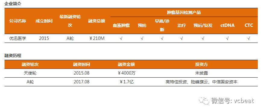 不论从患者覆盖率的角度上,还是从业务拓展的角度上,目前肿瘤基因检测行业的发展潜力都还非常大。肿瘤早筛和肿瘤复发监控还没成为诊疗过程中的常规项目,肿瘤患者群体中的检测覆盖率也只有5%上下。随着技术的发展和社会认可程度的提高,相信肿瘤基因检测行业的千亿级市场不仅仅是一纸空话。 九.企业案例 本报告所选案例不代表行业头部企业,企业先后顺序无特殊含义。 1. 优迅医学 优迅医学2015年在北京成立,至今已近完成了两轮总计2.1亿的融资,投资方包括高特佳投资、险峰旗云、中信国安资本等。