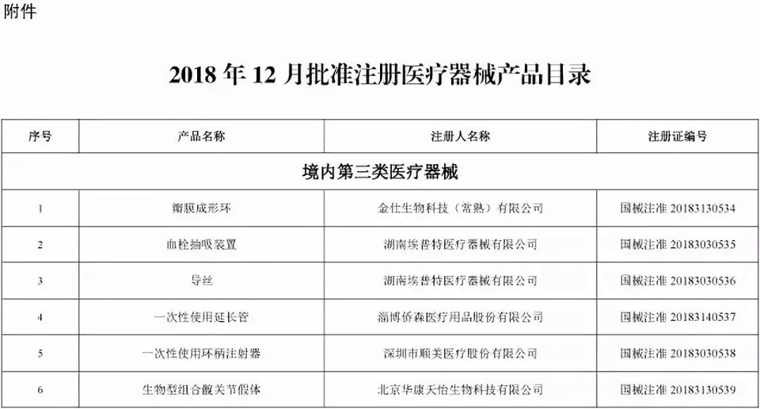 特此公告。 附件:2018年12月批准注册医疗器械产品目录
