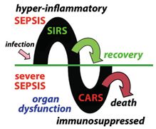大多研究者信任Dr Roger C.Bone的认识,旺盛的较高炎症SIRS(全身性炎症反应综合征)有更多的败血症。Bone协助强调“补偿性抗炎症反应综合征”的重要,这些被称为CARS(Compensatory Anti-Inflammatory ResponseSyndrome),经常跟随了高炎症相,特别在发展为被称为的“严重”败血症的病人(图1)。在严重败血症,广泛性的器官功能失调的证据也存在。这可包括:肺部、肝脏和/或肾损害,以及认知障碍。所以被称为败血症休克,这样的病人伤害到心血管衰竭,并经常对液体补充和血管加压药物治疗没有反应,经常为严重败血症的终极事件。