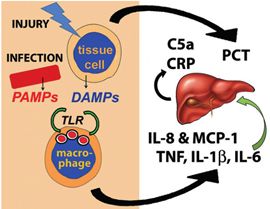促-炎症细胞因子作为败血症较高炎症阶段的标志物 TNF、IL-1β、和IL-6细胞因子,解调了先天性免疫系统对伤害或感染的初始反应。TNF和IL-1β二者激活了内皮细胞,吸引循环的多形核白细胞(PMN)到炎症点现场。它们也进入循环,造成发热和其他全身性的症状。IL-6增强了肝脏产生急性相的反应素,包括CRP,也刺激了骨髓内细胞产生的变化,所以产生了更多的多形核白细胞(PMN)。所以,这三个细胞因子基本上负责了SIRS的特征,与可能是潜在地用作败血症的生物标志物(图2)。 图2 败血症开始于或是感染或是组织伤害。来自入侵的有机物的PAMP(与病原体有关的分子模式)、或来自伤害的组织细胞的DAMP(与伤害有关的分子模式)(或二者),被巨噬细胞受体如TLR的识别。这造成产生促-炎症的细胞因子,如TNF、IL-1β、与IL-6以及趋化因子,如IL-8和MCP-1(单核细胞趋化因子)。IL-6刺激了肝脏产生CRP和补体蛋白。在干扰和伤害二者的刺激下,体内许多细胞也产生了PCT。