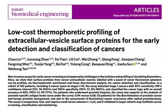 癌症的发生总是“悄无声息”,当真正被医生确诊时,也许患者早已病入膏肓。如果简单验个血就能解密癌症的“个性特点”,早日将癌症扼杀在萌芽之中,那该有多好! 日前,中科院国家纳米中心研究员孙佳姝团队构建了一套高“性价比”的癌症筛查方法:只需1微升血清(通常采血管采血量的1/5000),通过对其中细胞外囊泡的检测,就可在20分钟内对6种癌症进行早期筛查,同时也能较为准确地对癌症进行分类。 论文截图 近年来,研究发现血液及其他体液中含有癌症来源的物质,可以实现疾病的分子鉴定,有助于早期诊断、准确预测、个性化治疗以及疾病监测,这些物质主要包括循环肿瘤细胞(CTCs), 肿瘤细胞外囊泡(EVs),循环肿瘤DNA等。 “它们特指从原发肿瘤细胞脱落进入外周血液循环的生物标志物。”孙佳姝告诉《中国科学报》记者。 这种检测方法被称为肿瘤液体活检技术。孙佳姝介绍,该技术不仅可以用于某些类型实体肿瘤的早期诊断,而且能够监测肿瘤复发,评估疗效,具有标本易获得、创伤性小、非侵入性、可反复采集等优势。 作为液体活检标志物中的“后起之秀”,“肿瘤细胞外囊泡”是肿瘤细胞分泌到胞外环境的具有膜结构的囊泡,直径在30-1000 nm之间。 “癌细胞与正常细胞所分泌的EV呈现出不同膜蛋白特征,而这些特征差异就可以用于癌症的筛查与诊断。”孙佳姝表示,相较于循环肿瘤细胞和循环肿瘤DNA来说,肿瘤细胞外囊泡有着很大的优势,比如在血液中的含量丰富,其分析不需要采集大量血液。此外由于膜结构的保护,外泌体膜蛋白在长期冷存的血液中依然能够被分离和检测出来。 然而,理想很丰满,现实很骨感。将EV分析检测广泛应用于临床并不容易。过去的临床应用中,操作者需要长时间的超速离心从血液中提取EV,不仅如此,还容易受到共沉淀的杂蛋白影响。而后续膜蛋白分析手段,如酶联免疫吸附实验、蛋白免疫印迹和质谱等,过程复杂繁琐,成本高耗时长,且需要专业技术人员操作。 “如何在高背景血清或血浆样本中分离提取尺寸较小的EVs,如何提高EVs检测方法的灵敏度,是现有EVs肿瘤液体活检技术面临的重大挑战。”孙佳姝说,现在迫切需要一种更加简单、快速、廉价的EV分析检测手段。 孙佳姝课题组经过近十年的技术积累,找到“妙招”,成功实现了从技术平台向癌症筛查的成功转型。 研究人员首先利用荧光标记的核酸适体特异性识别EVs表面肿瘤相关膜蛋白,也就是在肿瘤细胞上打上“烙印”;接着,研究人员使用了“热泳”技术,通过激光照射微流控芯片后,产生温度梯度,诱导30-1000 nm的EVs快速汇聚至芯片中央,可富集1400倍,而游离的核酸适体或蛋白仍保持分散状态。EVs汇聚后,使用荧光显微镜读取结合在EVs上的核酸适体信号,从而获得EVs膜蛋白组学信息。 最后,研究人员取60份癌症患者与10份健康对照的血清样本,对每份样本进行7种抗原体多靶标检测,用检测结果训练机器学习算法,发现灵敏度与特异性都接近100%。 “利用极少量样本实现早期癌症灵敏度高检测(I期95%),并首次通过EVs进行癌症分类。”孙佳姝表示,不久的将来,这有望成为体检或医院常规的癌症筛查手段,医生只需要取出某种体液(例如血液),并对其中的EVs进行分析即可,以对患者造成更小创伤的方式,对疾病做出诊断。 下一步,他们希望拓展当前平台,实现膜内蛋白与核酸的检测,使之成为通用的EV检测平台。 |