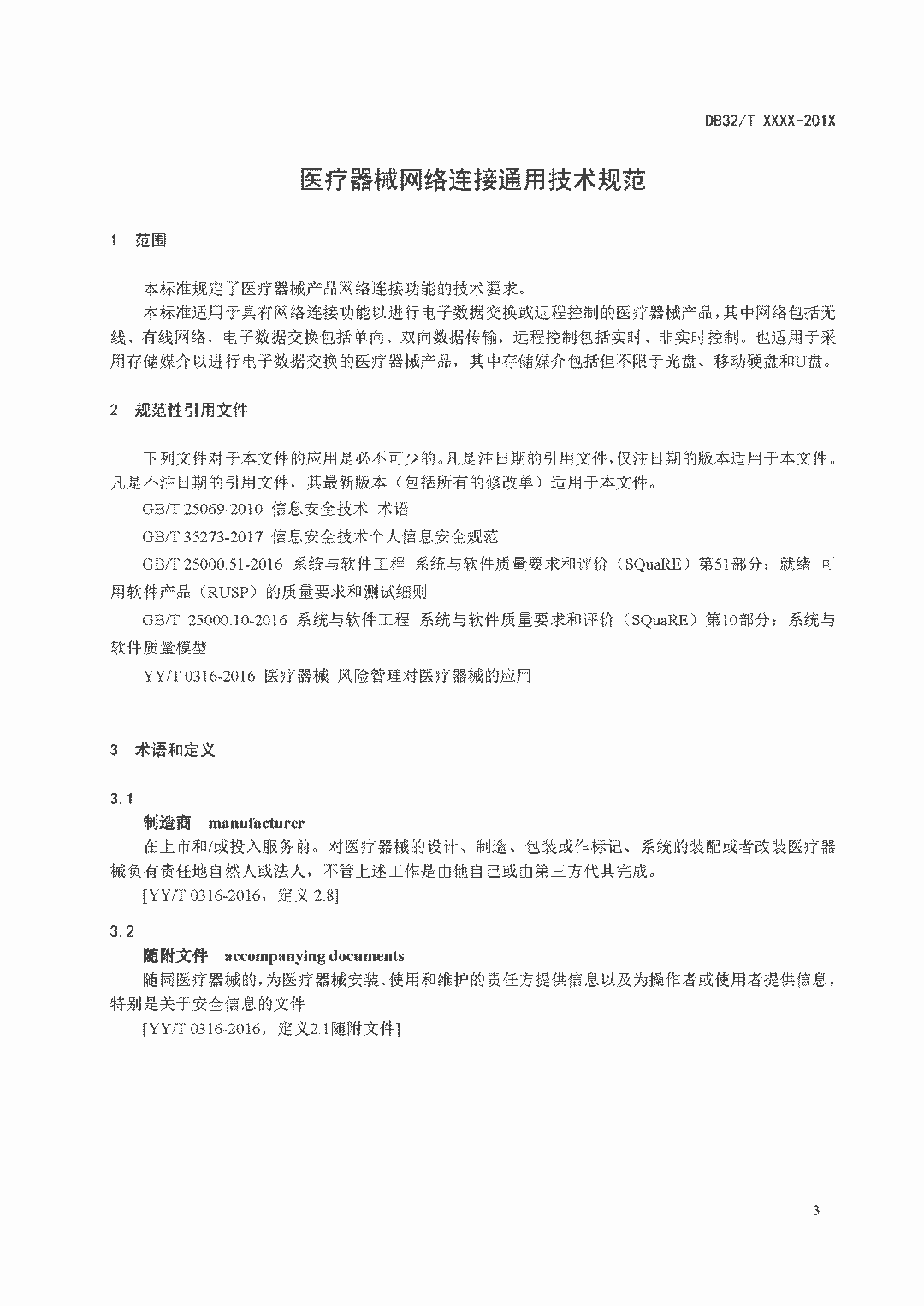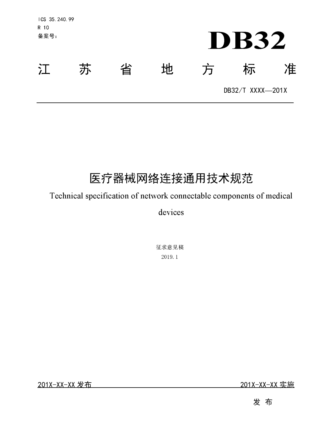 关于地方标准《医疗器械网络连接通用技术规范》征求意见稿的通知 各相关单位及专家: 经标准编制组努力,现已形成地方标准《医疗器械网络连接通用技术规范》征求意见稿。为确保标准质量,现面向社会广泛征求意见。 恳切希望您对该标准提出宝贵意见,并将意见于2019年02月15日前反馈给江苏省医疗器械检验所。 联系人:刘茹、李宁、刘颖、丁楠,025-69655621、025-69655986、025-69655623、jsmit_sc_st@163.com。 江苏省医疗器械检验所 2019年1月23日