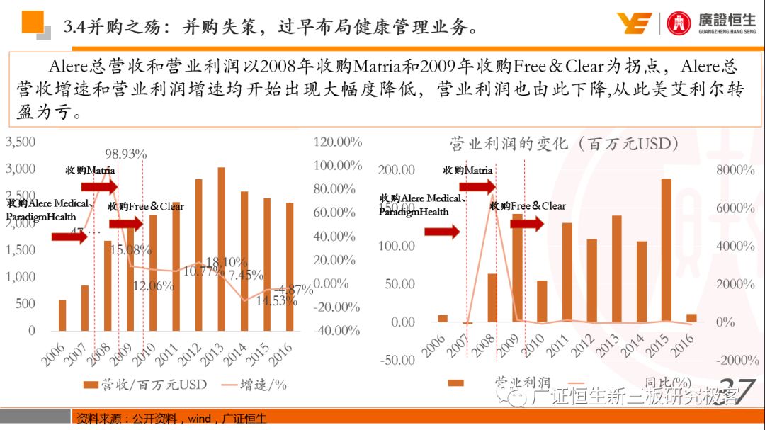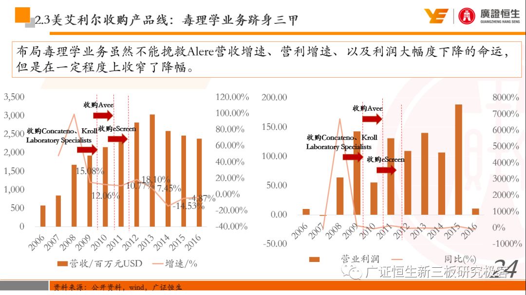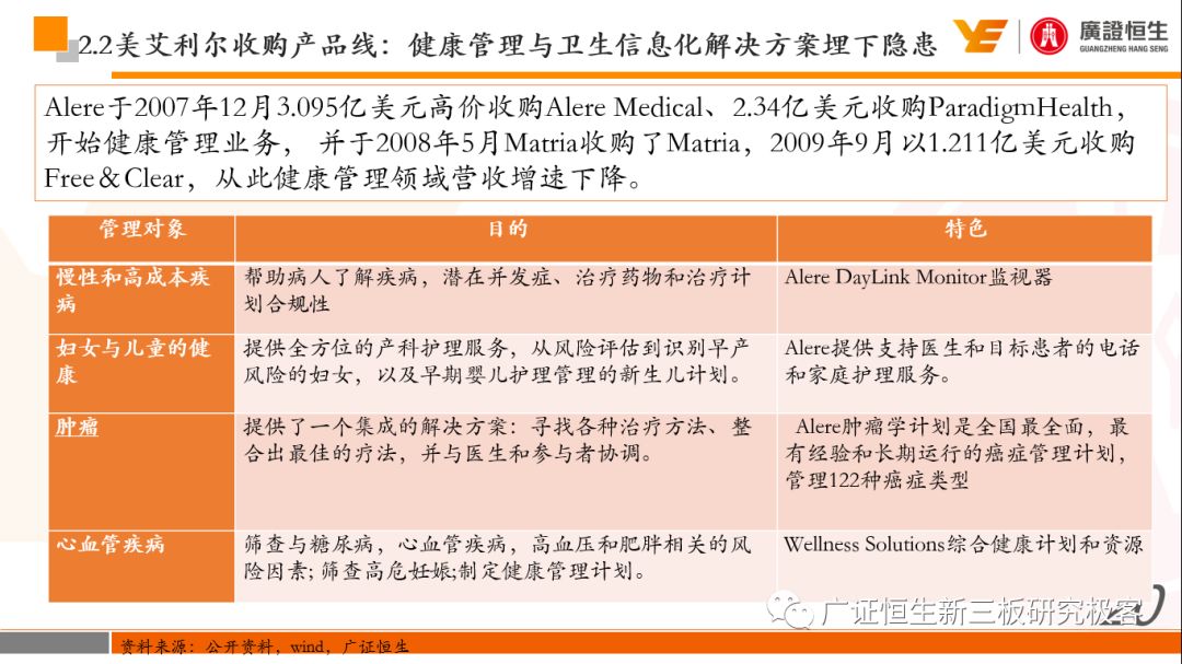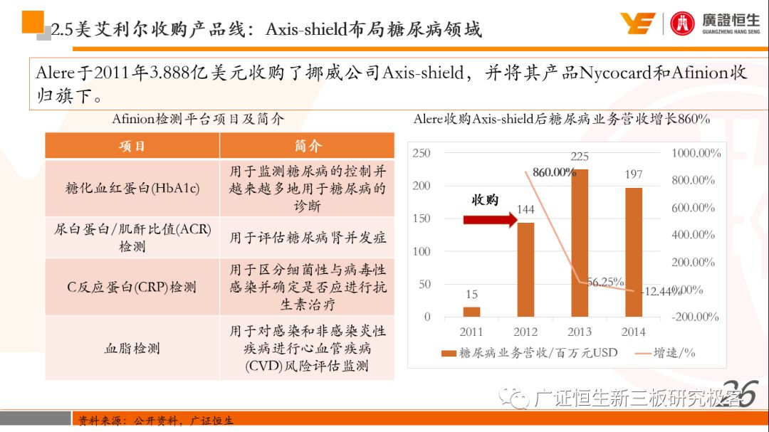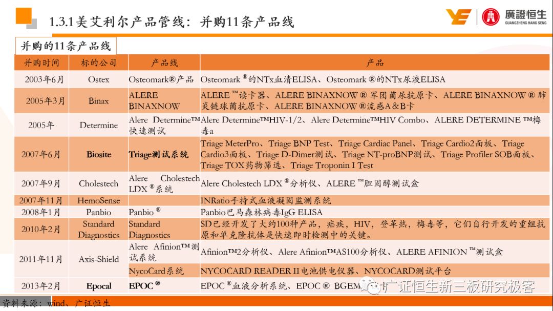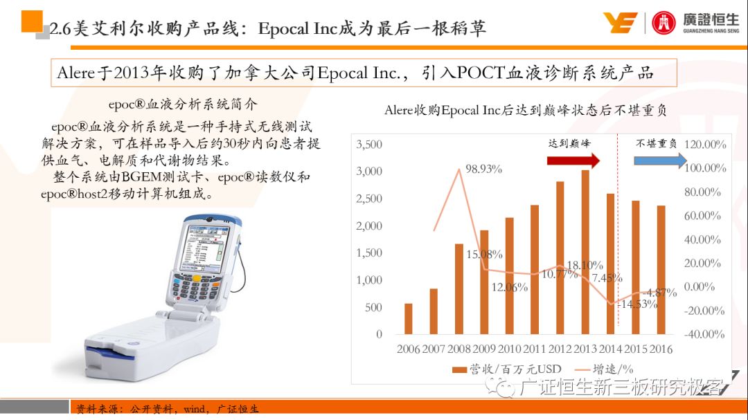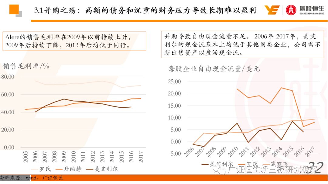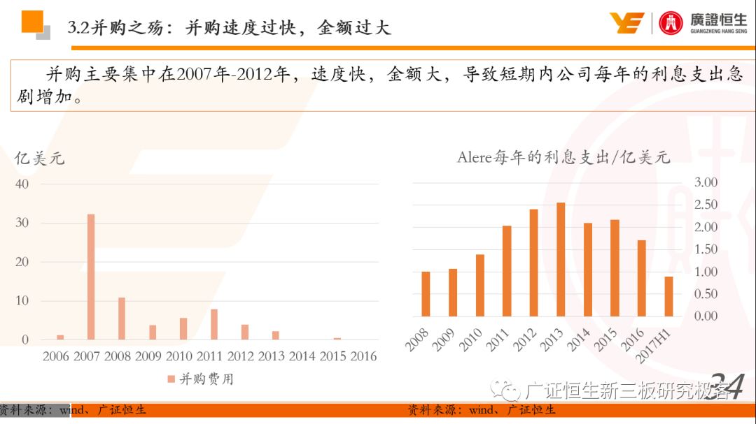本文观点: 1.作为占有全球细分领域20%市场份额的POCT龙头,美艾利尔(Alere)的成长路径值得整个行业学习,而最终被收购的原因也值得思考。 2.从成长路径来看,并购或者自研带来的始终领跑全球的POCT技术平台以及以心脏标志物、毒性物质以及传染病疾病诊断产品为代表的丰富产品是企业不断成长的基础。 3.分析最终被并购的原因,主要在于并购节奏太快,金额太大带来的沉重的财务压力,并造成研发投入严重不足;另外,过早布局健康管理业务对公司现金流造成了较大影响。 4.综合国内POCT行业的现状、美艾利尔的发展史、以及行业的发展趋势,我们建议:1)聚焦主业,增强POCT产品竞争力;2)自主研发与并购并重;3)始终保持优秀技术平台的储备。 1、美艾利尔发展史:产品的不断丰富造就全球POCT龙头 美艾利尔(Alere)是全球领先的POCT制造商,与罗氏、雅培等处于全球POCT领域的第一梯队,2016年营业收入23.76亿美元,约占全球POCT领域(血糖除外)120亿美元的20%份额。 从1991年成立至最后被收购,公司始终专注于POCT领域;将血糖业务分为两部分卖给雅培与强生为公司的业务扩张注入资本支持;而并购Biosite成就了其在POCT领域的龙头地位。 2013年收购Epocal后,美艾利尔发展到达顶峰;FDA审查成为压垮公司健康运营的最后一根稻草;CEO变更后,公司开始寻求被并购。 2017年4月14日,雅培和美艾利尔共同宣布,雅培将以总额53亿美元的价格收购美艾利尔。至此,雅培超越西门子与丹纳赫,成长成为全球IVD领域的第二大供应商。 2016年美艾利尔前三大产品线占比达到93%,包括传染性疾病诊断、心脏标志物、毒性物质。 美艾利尔产品管线中包括13条自主研发产品线,以及11条并购产品线。由于过重的负债带来的现金流压力以及经营战略安排,自2010年开始美艾利尔经历15次业务剥离。 2、并购是美艾利尔产品线迅速扩张的主要方式 从并购金额来看,美艾利尔主要是并购产品和技术,产比达到68%,其次是健康管理业务,最后是销售渠道。 从并购节奏来看,2007-2013年,通过大量并购迅速扩充产品线。布局健康管理业务是美艾利尔营收增速的分水岭,从此之后营收增速一蹶不振。 美艾利尔于2007年18亿美元高价收购Biosite,奠定在毒理学和心肌标志物上的领导地位;2007年3.546亿美元高价收购Cholestech,进军血脂测试领域;再加上2.436亿美元亿美元高价收购Hemosense,从此在心血管检测领域处于领先地位。 心血管产品线的收购极大扩大了美艾利尔的营业收入与营业利润规模。美艾利尔2007年收购Biosite、Choletech、Hemosense后营收增长98.93%;收购Biosite后营业利润增长6703.1%。 美艾利尔于2007年12月3.095亿美元高价收购Alere Medical、2.34亿美元收购ParadigmHealth,从此进军健康管理业务,并于2008年5月Matria收购了Matria,2009年9月以1.211亿美元收购Free&Clear,从此健康管理领域营收增速下降。 与此相适应的是,美艾利尔总营收和营业利润以2008年收购Matria和2009年收购Free&Clear为拐点,总营收增速和营业利润增速均开始出现大幅度降低,营业利润也由此下降。 美艾利尔于2009年8月以2.114美元收购Concateno,2010年2月以1.095亿美元收购Kroll Laboratory Specialists,2011年10月以1.25亿美元收购Avee,2012年4月以2.95亿美元收购eScreen,布局毒理学业务,从2011年到2012年,毒理学贡献了大约1.999亿美元的增长。 布局毒理学业务虽然不能挽救美艾利尔营收增速、营利增速、以及利润大幅度下降的命运,但是在一定程度上收窄了降幅。 美艾利尔于2010年1.621亿美元收购韩国公司Standard Diagnostics.,扩大了在传染病领域的影响力; 2011年3.888亿美元收购了挪威公司Axis-shield,并将其产品Nycocard和Afinion收归qixia; 2013年收购了加拿大公司Epocal Inc.,引入POCT血液诊断系统产品。 2006-2008年,美艾利尔维生素和营养补充剂业务营收占比从14%降到了5%,而健康管理与信息解决方案业务(ACS业务)在2008-2013年同样发展缓慢。2014年公司开始专注于专业诊断业务,维生素和营养补充剂业务以及ACS业务均在2014年以前剥离。 健康管理业务营收增速缓慢,以及毛利率过低是公司剥离ACS业务的主要原因。 3、美艾利尔最终被并购的原因解析 经过2007年的巨额并购,美艾利尔2008-2013年的营业收入持续增加,在2013年达到最高点。然而相比于营业额的迅速增长与市场占有率的提高,公司的盈利情况一直受到投资者所质疑,2010-2014年持续处于亏损状态,公司终究无法持续扩张,自己也终于走上了被并购之路。 美艾利尔的销售毛利率在2009年以前持续上升,2009年后持续下降,2013年后均低于同行。并购导至自由现金流量不足,2006年-2017年美艾利尔的现金流基本上均低于其他同类企业,公司需不断出售资产以盘活现金流。 资产负债率方面美艾利尔始终远高于丹纳赫,虽然罗氏在2008年-2012年的资产负债率过高,但最终下降,而美艾利尔的资产负债基本呈现连续增加,居高不下。 美艾利尔的并购主要集中在2007年-2012年,速度快,金额大,导至短期内公司每年的利息支出急剧增加。 在公司2007年开始执行激进的并购发展策略以来,虽然公司规模不断增大,每年研发投入的增长却不明显。 2014年以前研发费用均远低于并购费用,2014年后并购费用大幅减少,但是研发投入依旧不足。 过早布局健康管理业务为公司埋下隐患。与诊断产品线的并购不同,健康管理业务的营收速度持续放缓,2010年开始收入下降;而与诊断业务相比,该业务毛利率很低。 美