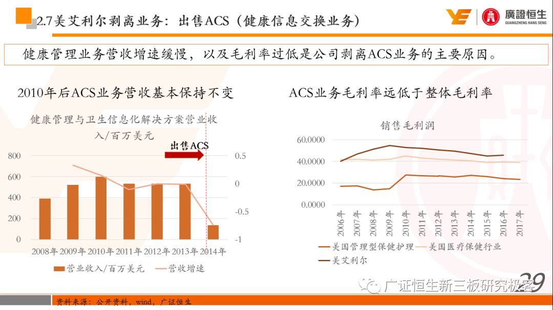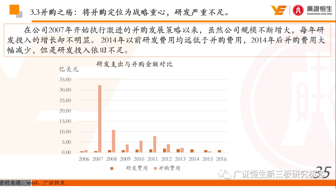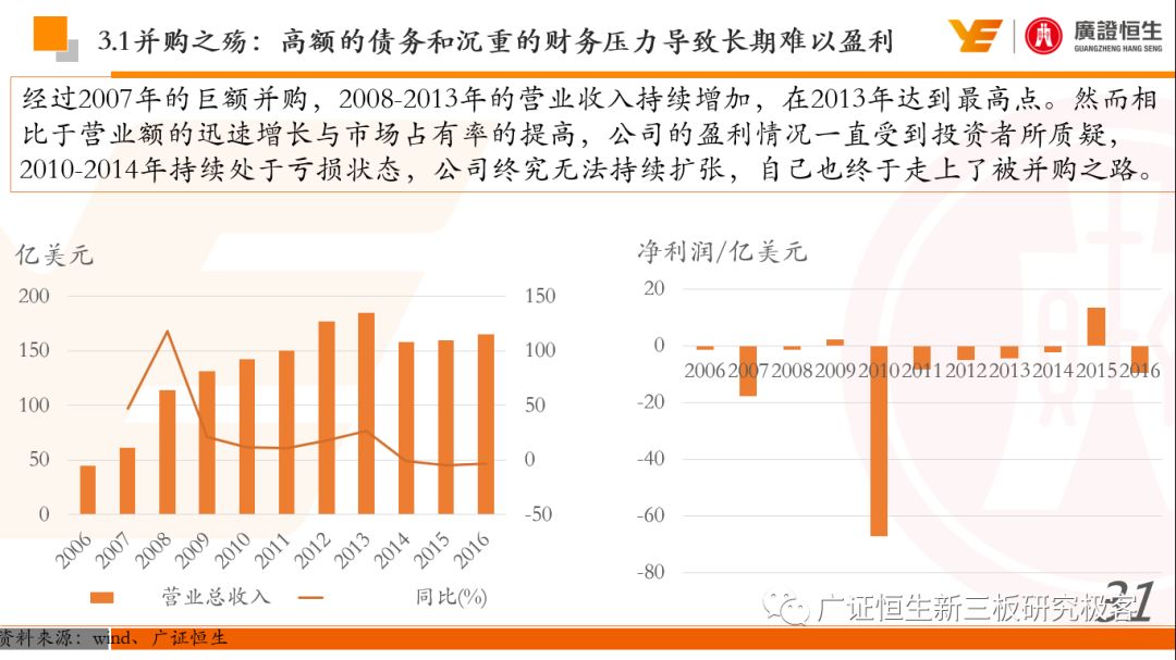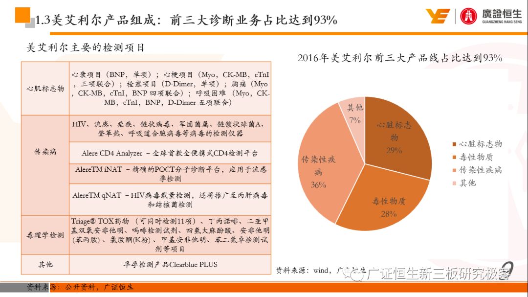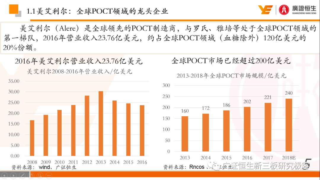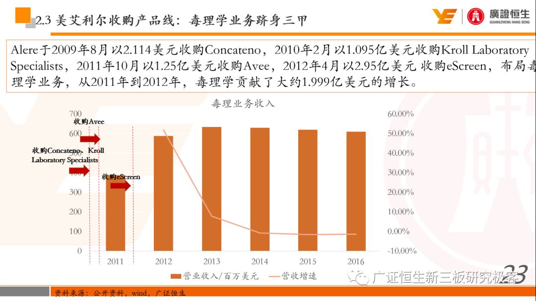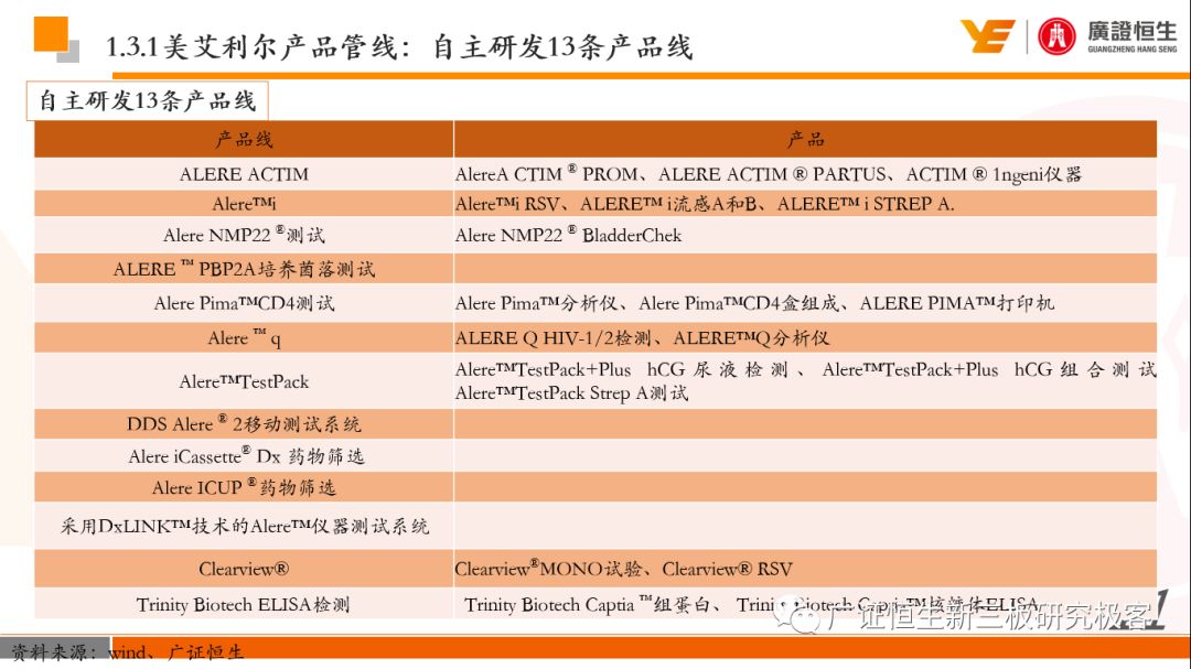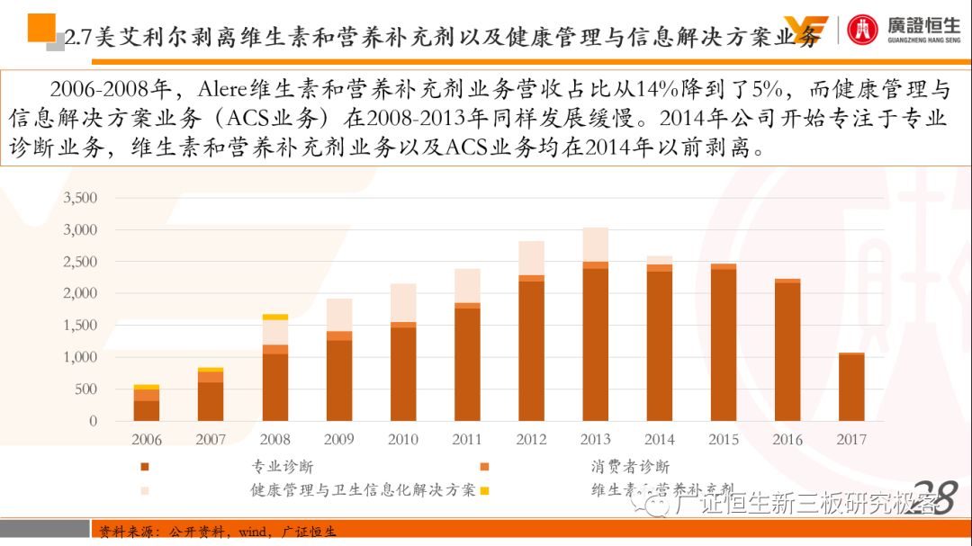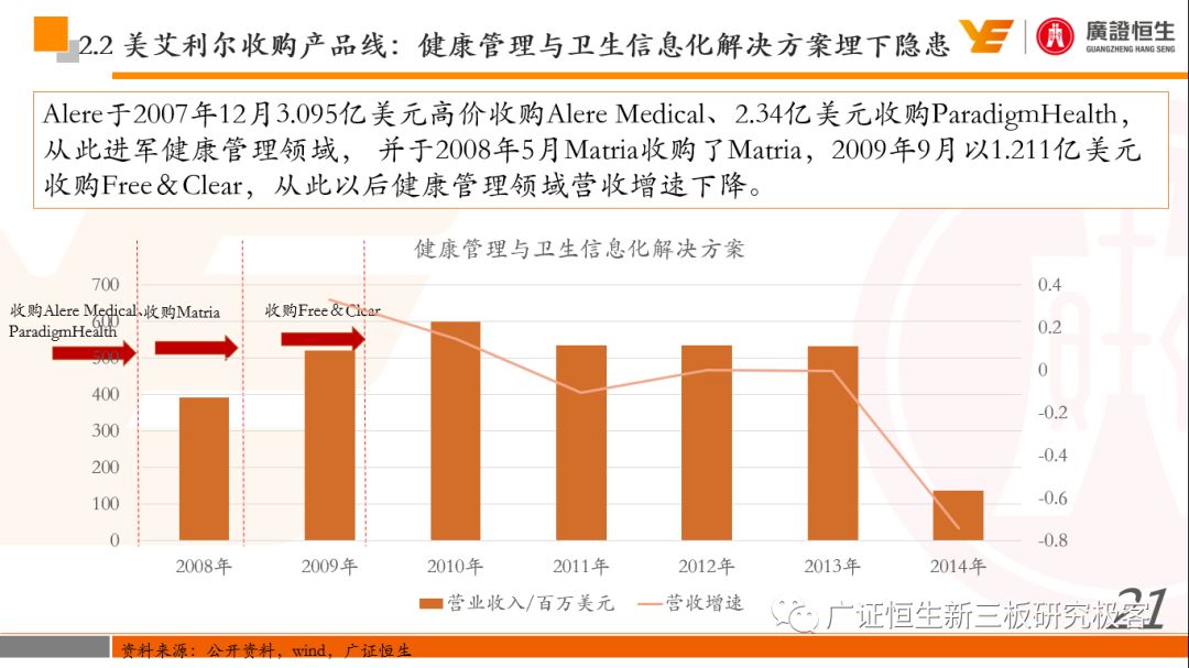 本文观点: 1.作为占有全球细分领域20%市场份额的POCT龙头,美艾利尔(Alere)的成长路径值得整个行业学习,而最终被收购的原因也值得思考。 2.从成长路径来看,并购或者自研带来的始终领跑全球的POCT技术平台以及以心脏标志物、毒性物质以及传染病疾病诊断产品为代表的丰富产品是企业不断成长的基础。 3.分析最终被并购的原因,主要在于并购节奏太快,金额太大带来的沉重的财务压力,并造成研发投入严重不足;另外,过早布局健康管理业务对公司现金流造成了较大影响。 4.综合国内POCT行业的现状、美艾利尔的发展史、以及行业的发展趋势,我们建议:1)聚焦主业,增强POCT产品竞争力;2)自主研发与并购并重;3)始终保持优秀技术平台的储备。 1、美艾利尔发展史:产品的不断丰富造就全球POCT龙头 美艾利尔(Alere)是全球领先的POCT制造商,与罗氏、雅培等处于全球POCT领域的第一梯队,2016年营业收入23.76亿美元,约占全球POCT领域(血糖除外)120亿美元的20%份额。 从1991年成立至最后被收购,公司始终专注于POCT领域;将血糖业务分为两部分卖给雅培与强生为公司的业务扩张注入资本支持;而并购Biosite成就了其在POCT领域的龙头地位。 2013年收购Epocal后,美艾利尔发展到达顶峰;FDA审查成为压垮公司健康运营的最后一根稻草;CEO变更后,公司开始寻求被并购。 2017年4月14日,雅培和美艾利尔共同宣布,雅培将以总额53亿美元的价格收购美艾利尔。至此,雅培超越西门子与丹纳赫,成长成为全球IVD领域的第二大供应商。 2016年美艾利尔前三大产品线占比达到93%,包括传染性疾病诊断、心脏标志物、毒性物质。 美艾利尔产品管线中包括13条自主研发产品线,以及11条并购产品线。由于过重的负债带来的现金流压力以及经营战略安排,自2010年开始美艾利尔经历15次业务剥离。 2、并购是美艾利尔产品线迅速扩张的主要方式 从并购金额来看,美艾利尔主要是并购产品和技术,产比达到68%,其次是健康管理业务,最后是销售渠道。 从并购节奏来看,2007-2013年,通过大量并购迅速扩充产品线。布局健康管理业务是美艾利尔营收增速的分水岭,从此之后营收增速一蹶不振。 美艾利尔于2007年18亿美元高价收购Biosite,奠定在毒理学和心肌标志物上的领导地位;2007年3.546亿美元高价收购Cholestech,进军血脂测试领域;再加上2.436亿美元亿美元高价收购Hemosense,从此在心血管检测领域处于领先地位。 心血管产品线的收购极大扩大了美艾利尔的营业收入与营业利润规模。美艾利尔2007年收购Biosite、Choletech、Hemosense后营收增长98.93%;收购Biosite后营业利润增长6703.1%。 美艾利尔于2007年12月3.095亿美元高价收购Alere Medical、2.34亿美元收购ParadigmHealth,从此进军健康管理业务,并于2008年5月Matria收购了Matria,2009年9月以1.211亿美元收购Free&Clear,从此健康管理领域营收增速下降。 与此相适应的是,美艾利尔总营收和营业利润以2008年收购Matria和2009年收购Free&Clear为拐点,总营收增速和营业利润增速均开始出现大幅度降低,营业利润也由此下降。 美艾利尔于2009年8月以2.114美元收购Concateno,2010年2月以1.095亿美元收购Kroll Laboratory Specialists,2011年10月以1.25亿美元收购Avee,2012年4月以2.95亿美元收购eScreen,布局毒理学业务,从2011年到2012年,毒理学贡献了大约1.999亿美元的增长。 布局毒理学业务虽然不能挽救美艾利尔营收增速、营利增速、以及利润大幅度下降的命运,但是在一定程度上收窄了降幅。 美艾利尔于2010年1.621亿美元收购韩国公司Standard Diagnostics.,扩大了在传染病领域的影响力; 2011年3.888亿美元收购了挪威公司Axis-shield,并将其产品Nycocard和Afinion收归qixia; 2013年收购了加拿大公司Epocal Inc.,引入POCT血液诊断系统产品。 2006-2008年,美艾利尔维生素和营养补充剂业务营收占比从14%降到了5%,而健康管理与信息解决方案业务(ACS业务)在2008-2013年同样发展缓慢。2014年公司开始专注于专业诊断业务,维生素和营养补充剂业务以及ACS业务均在2014年以前剥离。 健康管理业务营收增速缓慢,以及毛利率过低是公司剥离ACS业务的主要原因。 3、美艾利尔最终被并购的原因解析 经过2007年的巨额并购,美艾利尔2008-2013年的营业收入持续增加,在2013年达到最高点。然而相比于营业额的迅速增长与市场占有率的提高,公司的盈利情况一直受到投资者所质疑,2010-2014年持续处于亏损状态,公司终究无法持续扩张,自己也终于走上了被并购之路。 美艾利尔的销售毛利率在2009年以前持续上升,2009年后持续下降,2013年后均低于同行。并购导至自由现金流量不足,2006年-2017年美艾利尔的现金流基本上均低于其他同类企业,公司需不断出售资产以盘活现金流。 资产负债率方面美艾利尔始终远高于丹纳赫,虽然罗氏在2008年-2012年的资产负债率过高,但最终下降,而美艾利尔的资产负债基本呈现连续增加,居高不下。 美艾利尔的并购主要集中在2007年-2012年,速度快,金额大,导至短期内公司每年的利息支出急剧增加。 在公司2007年开始执行激进的并购发展策略以来,虽然公司规模不断增大,每年研发投入的增长却不明显。 2014年以前研发费用均远低于并购费用,2014年后并购费用大幅减少,但是研发投入依旧不足。 过早布局健康管理业务为公司埋下隐患。与诊断产品线的并购不同,健康管理业务的营收速度持续放缓,2010年开始收入下降;而与诊断业务相比,该业务毛利率很低。 美
