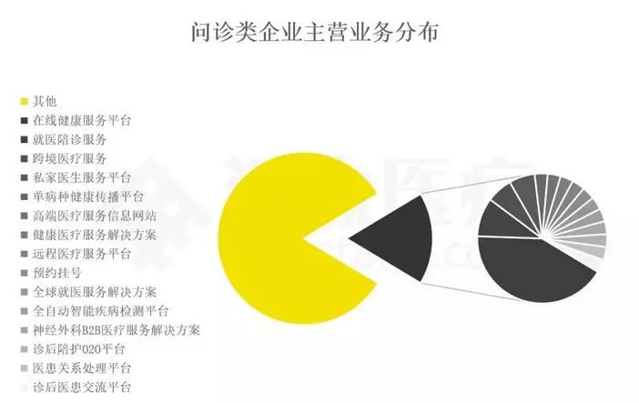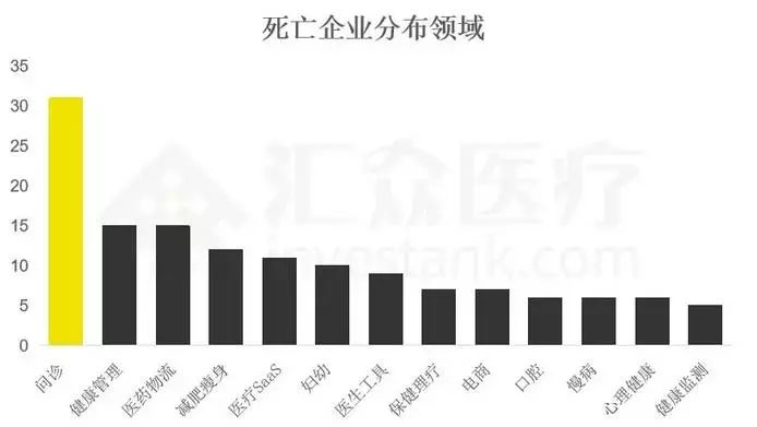 4 北上广成重灾区 死亡企业地区主要分布在全国的19个省市自治区,以北京数量最多,占比近50%。其次是广东、上海,占比在14%左右;浙江、江苏分别位列第四、第五,前五总计占比超84%。 5 TOP5领域占比近50% 汇众医疗将企业所在领域划分为35个子行业,其中数量在5家以上的有13个,包括问诊、健康管理、医药物流、医疗SaaS、减肥瘦身、医生工具、妇幼、口腔等,前三占比超过32%。 6 为什么这五大领域死亡比例最高 1) 问诊:轻视低频需求,占比超17% 问诊成为时下多数企业颠覆传统医疗的切入点,也是最完美体现“互联网+”的轻模式表达。死亡的问诊相关企业主要分为19大主营业务,其中针对综合疾病的“在线健康服务平台”最多,有13家,此外是跨境医疗服务有2家,其余业务各有1家。它们大部分成立于2014-2015年,而只有少部分经营时长超过2.8年。 汇众医疗分析认为,问诊类企业死亡比例最高的原因主要在于企业对医疗需求低频属性的不够重视,习惯性地通过其他行业的互联网模式来运营“互联网+”医疗,以“烧钱”战术造量,这种情况下,资本再雄厚,也扛不住烧钱的速度。