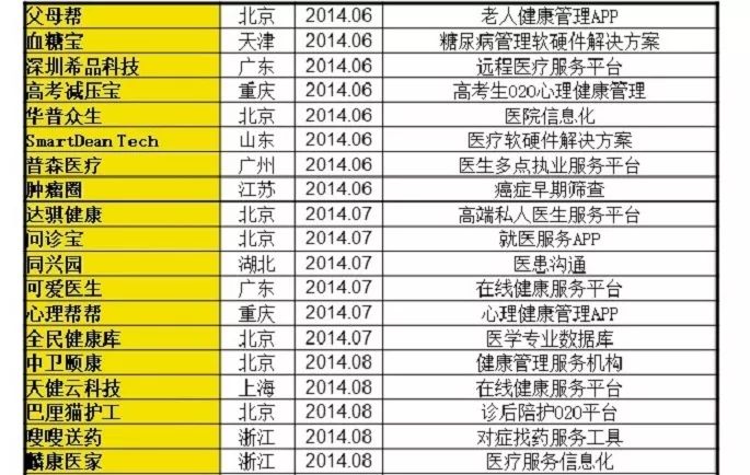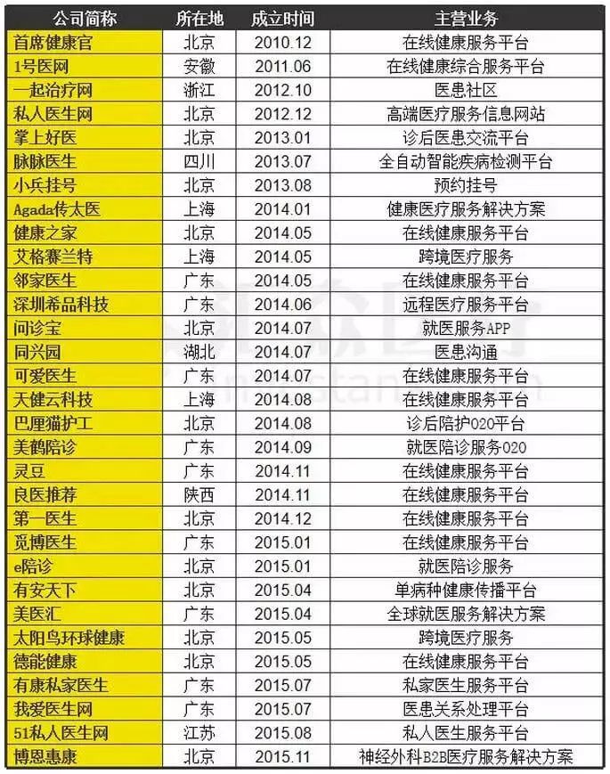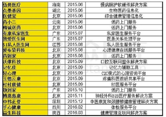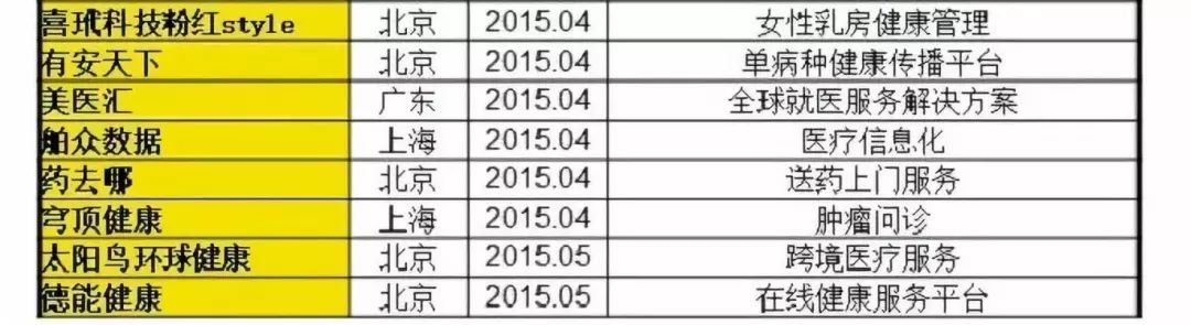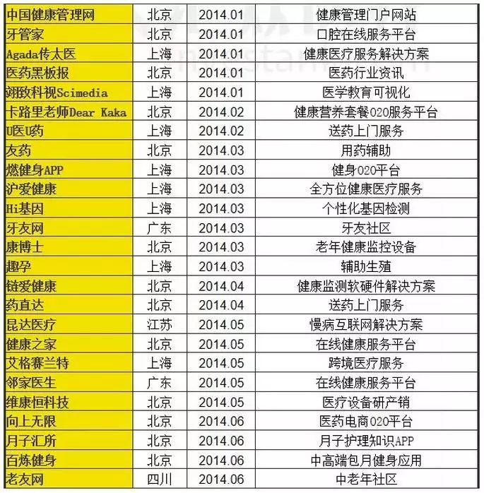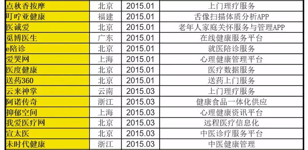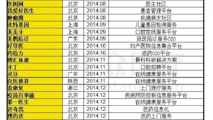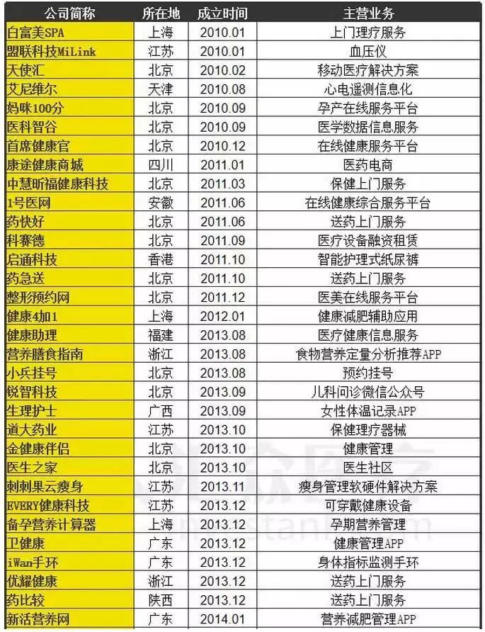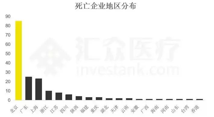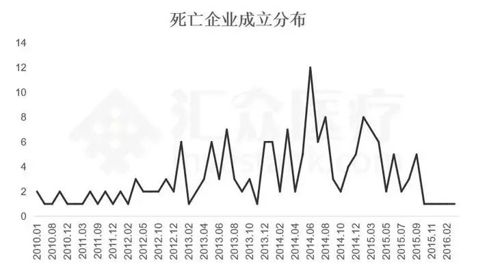 死亡企业TOP5领域占比近50%。 在全产业中,医疗算是一个相对逆周期的产业,需求始终存在,不会因为经济环境或者金融的变动而有太大的波动。随着“互联网+”浪潮的铺面而来,医疗产业随之诞生了无数的新兴模式,或轻或重。 根据汇众医疗的不完全统计,2010年后成立的医疗健康企业有近6000家,“互联网+”强势赋能医疗。但水可载舟,亦可覆舟,快速催生的企业总是有根基不稳。 据不完全统计,截至2018年年底,共有180家医疗健康企业停止运营。汇众医疗针对这180家企业做了梳理和简要的死因归类分析。将可能的致死原因分析整理出来,希望能引发产业人士更多的启示和思考,共同推动医疗健康产业的良性发展。 内容主要分为以下几部分 1. 判断死亡的标准 2. 企业数据来源及调研方式 3. 82%的死亡企业成立于2012-2015年 4. 北上广成重灾区 5. 死亡企业TOP5领域占比近50% 6. 为什么这五大领域死亡比例最高 7. 资本寒冬是理由吗 8. 附录:180家死亡企业全名单 判断死亡的标准 汇众医疗通过网络公开信息、电话调研及汇众医疗数据库,总结为以下四点作为医疗健康死亡企业的判断依据: 1) APP半年未更新、网站半年未更新或无法正常打开、企业微信公众号一年未更新; 2) 官网联系电话工作时间内无法接通或为空号; 3) 通过登记的住所或者经营场所无法联系; 4) 对外明确宣布破产清算; 2 企业数据来源及调研方式 1) 汇众医疗数据库; 2) 网络公开信息; 3) 电话调研; 3 82%的死亡企业成立于2012-2015年 根据汇众医疗(investank.com)的不完全统计,截至2018年12月31日,共计180家医疗健康企业停止运营。成立于2012-2015年间的企业占比近82%,这个时间正是创业创新大潮风起云涌的年代。
