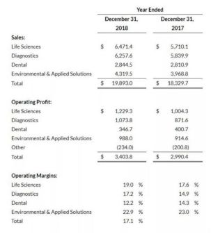 丹纳赫总裁兼首席执行官Thomas P. Joyce, Jr表示,“公司在2018年取得惊人业绩,实现收入和经营利润增长,并完成超20亿美元的战略收购。”