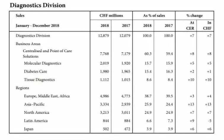 根据年报,制药和诊断为罗氏两大关键业务。2018年,制药业务实现收入449.53亿美元,同比增长7.31%,收入占比为77%;诊断业务实现收入131.68亿美元,同比增长7.31%,收入占比为23%。