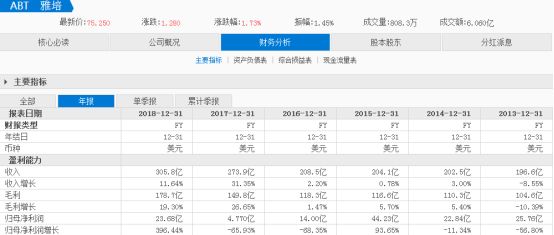 2013-2018年雅培年收入情况 (数据来源:东方财富网)