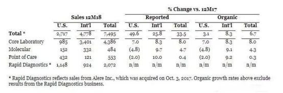 年报显示,雅培诊断业务由传统诊断、分子诊断、床旁诊断和快速诊断构成,其中传统诊断占比最大,营收规模为43.86亿美元,同比增长8%;收购后的快速诊断营收为20.72亿美元;床旁诊断营收为5.53亿美元,同比增长0.4%;分子诊断营收为4.84亿美元,同比增长4.7%。 2018年雅培诊断业务数据