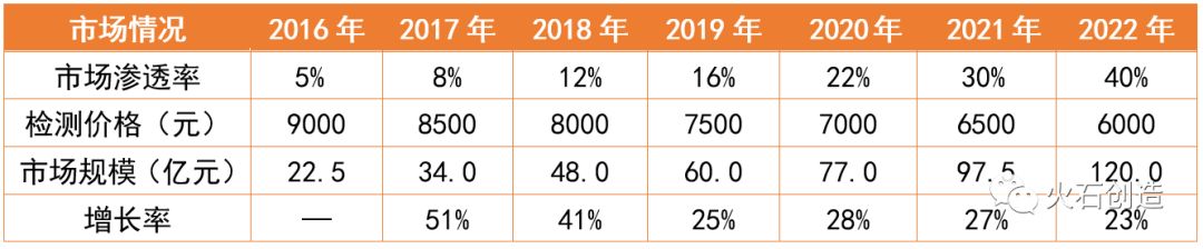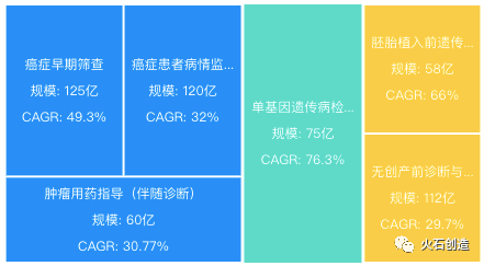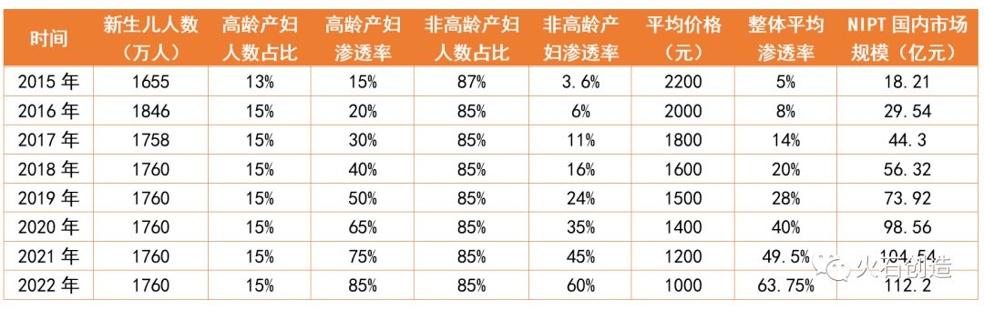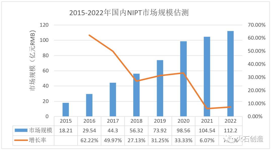 基因检测技术可用于医疗健康、农业育种、司法鉴定等多个行业,其中,最受关注的是医疗健康行业的临床应用。在《医健产业数据观系列 | 基因检测临床应用领域市场分析(上)》一文中,我们详细介绍了基因检测在医疗领域的临床应用,并对基因检测的全球与中国市场规模进行了估测分析。接下来,本文将对基因检测在临床应用领域的几个重点细分市场情况展开进一步分析。 基因检测在临床应用领域的几个重点细分市场规模预计2022年合计达到550亿元。其中,无创产前筛查(NIPT)是基因检测最为成熟的临床应用,处于市场渗透率快速增长的阶段,未来市场规模可达百亿元,但被龙头企业占据绝大部分份额;胚胎检测(PGD/PGS)尤其是胚胎移植前遗传学筛查(PGS)市场增长速度较快,潜在增长空间巨大。个体化用药尤其是癌症药物伴随诊断市场初步成熟,处于较快增长阶段,未来国内市场可达百亿。用于癌症患者病情监测(治疗预后、复发监控)与早期筛查的基因检测(包括液体活检)是更大的百亿级市场,预计2022年皆有望达到120~150亿元的市场规模。遗传病筛查与诊断方面易成规模的主要是单基因遗传病检测,市场容量百亿级,市场规模预计在2022年达到75亿元。 图5 基因检测临床应用领域的重点细分市场估测 注:规模为2022年市场规模;CAGR为2016~2022年均复合增长率 生殖健康服务领域基因检测市场分析 1、无创产前诊断与筛查(NIPT) (1)市场竞争格局 新生儿缺陷是在全球范围内普遍存在的问题,以我国为例,每年新生儿人数1600万人,出生缺陷发生率为5.6%,每年出生的缺陷新生儿约90万人,带来的社会总成本超过1000亿元。无创产前诊断与筛查(NIPT)是最早得到临床应用、推广的基因检测方法,华大基因和贝瑞基因已占该应用领域国内市场近70%份额,市场格局已基本稳定。两家头部企业将在很长一段时间里继续保持领先,后进入者很难再有机会改变市场格局。 NIPT市场渗透率还有较大提升空间,自2016年卫生部门取消NIPT试点后,NIPT价格也迅速降低,目前各地价格大致在1000元-2000元之间,深圳市将NIPT纳入医保目录,可见该领域已逐渐走向普及应用,竞争日趋激烈。 (2)市场规模估测 表2 国内NIPT市场规模估测方法依据 据统计,2016年,我国共有1846万新生儿出生,其中大约有276万高龄高危产妇,1570万普通产妇。2016年我国高龄产妇无创产前基因测序渗透率约为20%,非高龄产妇无创产前基因测序渗透率约为6%,估算2016年我国无创产前基因测序市场规模约为29.54亿元。2018年产前基因检测市场规模约为56亿元,随着基因检测价格降低与用户教育提升,当整体市场渗透率达到40%,市场规模将达百亿元。以覆盖人群1760万、渗透率40%、单价1400元计算,预计2020年国内无创产前检测的市场规模为98.56亿元,2020-2022年由于技术进步,市场渗透接近饱和且竞争加剧,有可能增长率放缓至10%以下,预计2022年可达到112.2亿元,2015-2022年间的年均复合增长率约为29.66%。 图6 国内无创产前诊断与筛查(NIPT)市场规模估测 2、植入前胚胎遗传学诊断与筛查(PGD/PGS) PGS/PGD是第三代辅助生殖的核心技术服务,其中PGS(胚胎植入前遗传学筛查)比PGD(植入前胚胎遗传学诊断)的适用人群更广,是第三代辅助生殖基因检测服务的主要增量市场。 (1)市场规模估测 表3 2016-2022年国内PGD/PGS市场规模粗略估算方法 2016年中国辅助生殖服务市场约180亿元,到2022年预计将达到387亿元。辅助生殖中心目前的收入结构中,胚胎检测大约占到20%,即用于辅助生殖的胚胎检测市场容量2016年约为36亿,预计2020年增长至77.4亿元。由于目前市场上存在较多的一代、二代辅助生殖技术服务并未完全采用PGS/PGD,PGS/PGD的实际市场规模应该更小,但处于较快增长态势。假设2022年PGS/PGD服务在胚胎检测服务市场中占比为75%,则基因检测应用于PGS/PGD服务的市场规模在2022年有望达到58亿元,2016-2022年期间年均复合增长率约为66%。 图7 国内植入前胚胎遗传学诊断与筛查市场规模估测 (2)市场容量估算 据估计,试管婴儿有千亿美元的市场。国内每年出生的婴儿数量约为1600万,按12.5%~15%的不孕不育发病率计算,理论上每年应该还有200万~240万的婴儿因为不孕不育无法降生。假设这部分婴儿的父母中的60%选择试管婴儿手术,则每年进行试管婴儿手术的夫妇为120万~144万对。由于国内试管婴儿平均成功率不足30%,假设每对夫妇平均进行2.4次试管婴儿手术,按平均每周期PGS/PGD收费2500元计算,则潜在市场规模达80亿元。 肿瘤诊疗临床应用领域基因检测市场分析 基因检测在肿瘤诊疗方面临床应用主要有四大细分领域,按照发展成熟程度依次为:个体化用药诊断(确诊患者分子分型,包括用药伴随诊断与补充诊断);肿瘤患者病情监测(确诊癌症患者的治疗预后、复发监控);肿瘤/癌症早期诊断(疑似癌症患者辅助诊断、高危人群早期筛查);肿瘤易感基因检测(健康人群、高危人群的患癌风险评估)。 预计2022年肿瘤基因检测市场规模高达约300亿元RMB。测算依据如下:①根据国家癌症中心发布数据,2015年中国新增癌症患者429万,死亡患者286万,我国5年内诊断为癌症且仍存活的病例数约为749万,预计2017年存量肿瘤患者接近1300万人,②假设2022年存量肿瘤患者增长至1800万人,随着基因检测技术发展及肿瘤个体化用药的爆发,预计2025年肿瘤基因检测在肿瘤患者中渗透率达30%-40%。③目前我国市场上肿瘤基因检测的价格区间大致