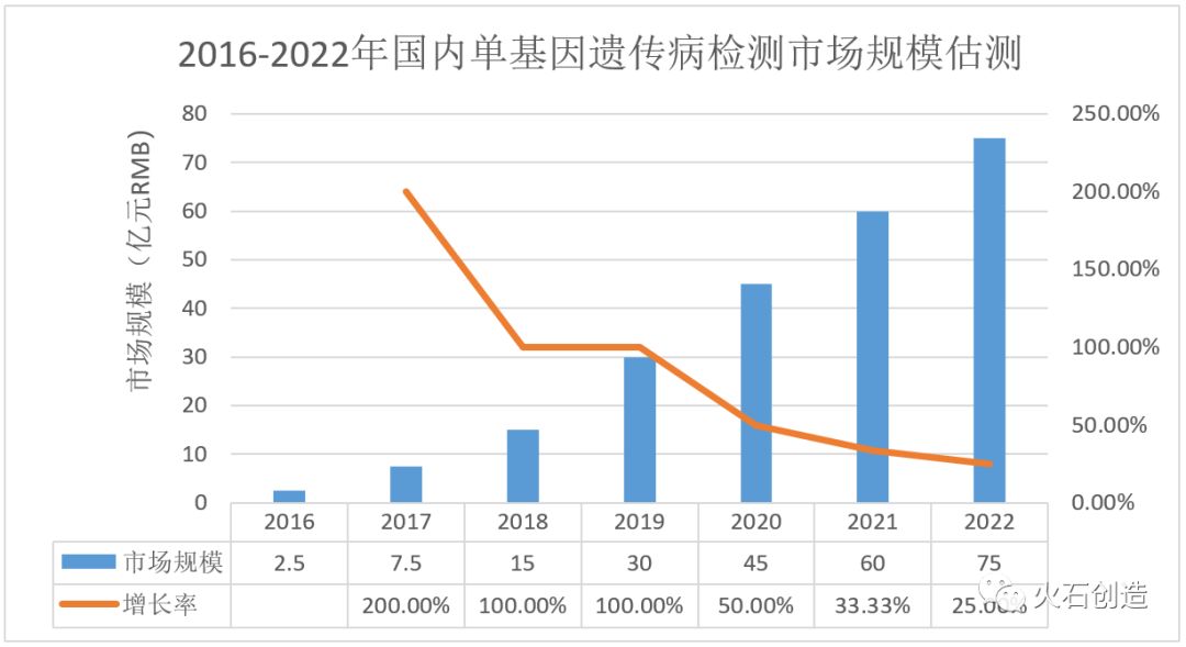 在美国,靶向药在肿瘤患者用药结构中占比超过50%,而中国目前约为10%-20%,抗癌药物尤其是靶向药物的伴随诊断市场增长空间仍然较大。未来,预计400万新增肿瘤患者中约30%能从基因检测用药指导中获益,即每年检测超过100万人次。由于肿瘤患者常见耐药和复发情况,假设患者每年做两次基因检测(市场上肿瘤基因检测产品价格大概在7000元-20000元之间,均价10000元),则未来肿瘤基因检测在用药指导方面的潜在市场规模可达100亿元,不过可能需要3~5年才能逐渐达到。预计基因检测用于肿瘤用药指导或抗癌药物伴随诊断的市场规模将从2016年的12亿元增长至2022年的60亿元,2016-2022年期间年均复合增长率约为30.77%,增速高于全球平均水平。 (2)市场竞争格局 肿瘤基因检测市场格局仍未稳定,绝大多数肿瘤基因检测公司的主要业务集中于用药指导,该市场产品差异化程度还不明显。预计随着NGS肿瘤基因检测高通量试剂盒陆续获批,及更多靶向药包括PD-1免疫检查点抑制剂的上市,该领域市场竞争格局将更为清晰,企业竞争也将走向差异化。肿瘤靶向用药基因检测行业分散,涉足企业繁多,头部企业占据竞争优势。目前具有较大规模的企业包括A股上市公司华大基因、艾德生物,以及一级市场的燃石医学、世和基因、吉因加、领星生物、思路迪等。 肿瘤免疫基因检测拥有较高壁垒,较强的核心技术是企业竞争力的关键。肿瘤免疫基因检测尚处于发展早期,存在较多技术问题。现有研究发现,PD-L1表达量、肿瘤突变负荷(TMB)、微卫星不稳定性(MSI)、新生抗原(neoantigen)等生物标志物与肿瘤免疫治疗效果具有较强相关性,但是其临床应用仍有较多挑战,生物标志物的预测和鉴定技术非常复杂,并且很难得到较高准确率。因此拥有较强核心技术的企业方能在此领域脱颖而出。 2、癌症患者病情监测(治疗预后、复发监控) 基因检测用于癌症患者病情检测(治疗预后和复发监控)的市场巨大,市场渗透率将随临床应用成熟与检测价格下降而快速增加。 表4 国内癌症患者病情监测应用市场规模估测 近年来,我国诊断为癌症且5年内存活的患者人数为749万人,假定其中约2/3的肿瘤患者即至少500万人适合使用基因检测(含液体活检)技术用于病情监测,仅以已确诊的存量肿瘤患者为例,假设至2022年,中国这500万确诊肿瘤患者中约40%平均做一次基因检测用于病情监测(治疗预后与复发监控),以单次检测价格为4000-8000元计,保守估算2022年用于病情监测的基因检测市场容量将达到80亿-160亿元,若取单次检测价格的中位数6000元,则2022年该市场规模约为120亿元,因此肿瘤基因检测用于病情监测的市场高达百亿级。假设适用患者人数不变,2016年-2022年期间该市场渗透率的年均复合增长率约为38%,单次检测平均价格每年下降500元,则2016年-2022年期间用于病情监测的肿瘤基因检测市场年均复合增长率约为32%。 3、肿瘤/癌症早期诊断(高危人群早期筛查,疑似癌症患者的辅助诊断) 由于中国中老年群体人数众多,基因检测用于癌症早期筛查的市场潜力巨大,渗透率将随着液体活检技术成熟与推广逐步提升。 市场规模估测 在中国,癌症的发生和年龄、环境非常相关。我国45岁以上中老年群体约5亿人,假设其中约50%即2.5亿人为潜在消费人群,癌症早筛渗透率为2%到15%,如果最终使用肿瘤早筛产品的单次检测平均价格是2000元RMB,那么市场规模就是百亿到千亿元RMB量级。基于基因检测的液体活检有望成为癌症早筛的未来主流技术,预计国内癌症早筛市场为100~750亿元RMB,该市场需要5~15年逐渐培育成熟。 表5 国内癌症早期筛查应用市场规模估测 假设中国高龄人群中约2.5亿人为潜在消费人群数量不变,2022年癌症早筛基因检测服务的市场渗透率有望达到2.5%,肿瘤早筛产品的单次检测平均价格是2000元RMB,则2022年癌症早筛基因检测市场规模约为125亿元RMB。2016年-2022年期间该市场渗透率的年均复合增长率约为16%,单次检测平均价格在2016年为4500元RMB,且此后每年下降500元至2000元RMB,则2016年-2022年期间用于病情监测的肿瘤基因检测市场年均复合增长率约为49.3%。 单基因遗传病基因检测市场分析 遗传病相关基因检测市场主要集中在单基因遗传病的基因检测,新婚夫妇的单基因遗传病携带情况筛查对于遗传疾病的防治最为关键。 (1)市场容量预测 目前的单基因遗传病检测产品主要为成人及儿童服务。从预防单基因遗传病的角度上讲,新婚夫妇的单基因遗传病携带情况筛查对于单基因遗传病的防治最为关键。让待孕的新婚夫妇了解到单基因遗传病的危害,并为其提供可靠的单基因遗传病服务,可能会构成单基因遗传病检测的最大一片市场。 另外新生儿也是单基因遗传疾病检测的一大对象,新生儿基因检测大多包括常见的单基因遗传性疾病,如地中海贫血、罕见病、新生儿耳聋等。但这些遗传性疾病中的大多数尚无成熟的治疗手段,仅个别病种可提前干预,故新生儿基因检测属于非刚需产品。 随着基因检测的普及,新生儿基因检测最可能在疑似患有罕见病的婴幼儿中应用。 (2)市场规模估测 图9 国内单基因遗传病检测市场规模估测 根据近年来卫生部发布的统计公报,我国每年办理结婚登记数量保持在1000万对左右,有约2000万人应进行婚前检查。目前市场上单基因遗传病检测产品的价格约2500元,以产品最大渗透率为20%计,估计单基因遗传病检测潜
