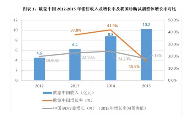 自身免疫诊断试剂发展比较晚,近五年增长率高于体外诊断行业整体增长。2018年市场规模20-30亿,预计每年增长幅度为25%左右。自免疾病在我国部分地区仍然没有得到重视,存在大量的误诊,患病率被低估。三级医院占了自免诊断试剂90%的市场份额,二级医院仅10%,一级医院空白,市场极度不平衡。因此自身免疫诊断前景十分广阔。 从市场格局上看,自身免疫诊断并不是一个竞争十分激烈的领域,传统王者欧蒙占据半壁江山,国内的亚辉龙、浩欧博、科新生物快速崛起,占据30%左右的市场。罗氏,雅培等诊断巨头并没有进入这个行业。 自身免疫检测试剂一般都是按疾病分组,每种疾病一般检测多个指标。根据国家发改委、卫生部、中医药管理局2012年颁布的《全国医疗服务价格项目规范》,自身免疫检测项目一共有523项,单个项目收费一般在20-120元之间,组合项目收费一般在65-200元之间,高于体外诊断整体价格的中位数。 欧蒙 欧蒙诊断可以说是是自身免疫检测领域的全球领导者,成立于1987年9月,总部位于德国,在全球近20个国家的主要城市设有分公司,目前全球有约2400名员工。除自身免疫疾病以外,还在感染性疾病和变态反应性疾病诊断领域拥有先进的检测产品和技术。 2017年12月19日,珀金埃尔默(PerkinElmer, NYSE: PKI)在美国发布公告称,完成了对欧蒙诊断100%股权的收购,总价约为13亿美元(折合人民币85亿元)。 被收购后,欧蒙诊断(中国)有限公司经历了领导人大换血、营销政策改变等一系列变动,目前在自身免疫检测领域受到国有厂家的冲击,市场占有率已大不如前。