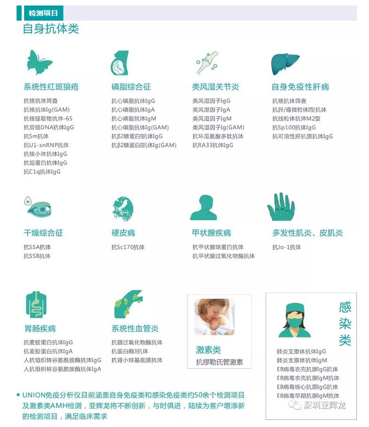 从上表可以看出,总体来看自免诊断试剂近3年的增速高于中国诊断试剂行业的整体水平,但欧蒙在中国的增长率是逐年降低的。如果考虑到国内的深圳亚辉龙、苏州浩欧博、上海科新以及外资的沃芬、Human等企业在该领域的竞争,欧蒙中国的市场份额已大不如前。 亚辉龙 亚辉龙成立于2008年,作为中国自身免疫性疾病和感染性疾病检测领域的先驱品牌,创造性地推出了UNION免疫分析仪、Tenfly Blot全自动蛋白印迹仪、Tenfly Auto全自动免疫印迹分析仪及配套试剂,为自身抗体检测提供完美的实验室解决方案。同时推出UNISON金标免疫分析仪及配套试剂、VISION全自动动态血沉分析仪打造体外诊断床旁及时检测(POCT)平台。 亚辉龙始终将方便、准确、快捷的自身抗体检测解决方案作为公司的研发方向,不断为中国自身免疫类疾病的临床辅助诊断提供全面的产品和服务。 公司自主研发的中国第一台独立单人份全自动感染免疫分析仪UNION,目前涵盖自身免疫类和感染免疫类约50余个检测项目,能极大地满足临床需求。